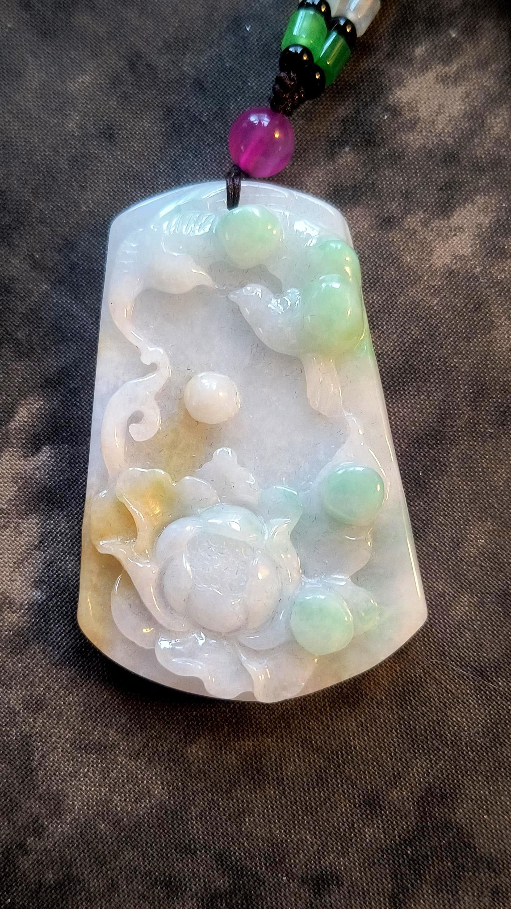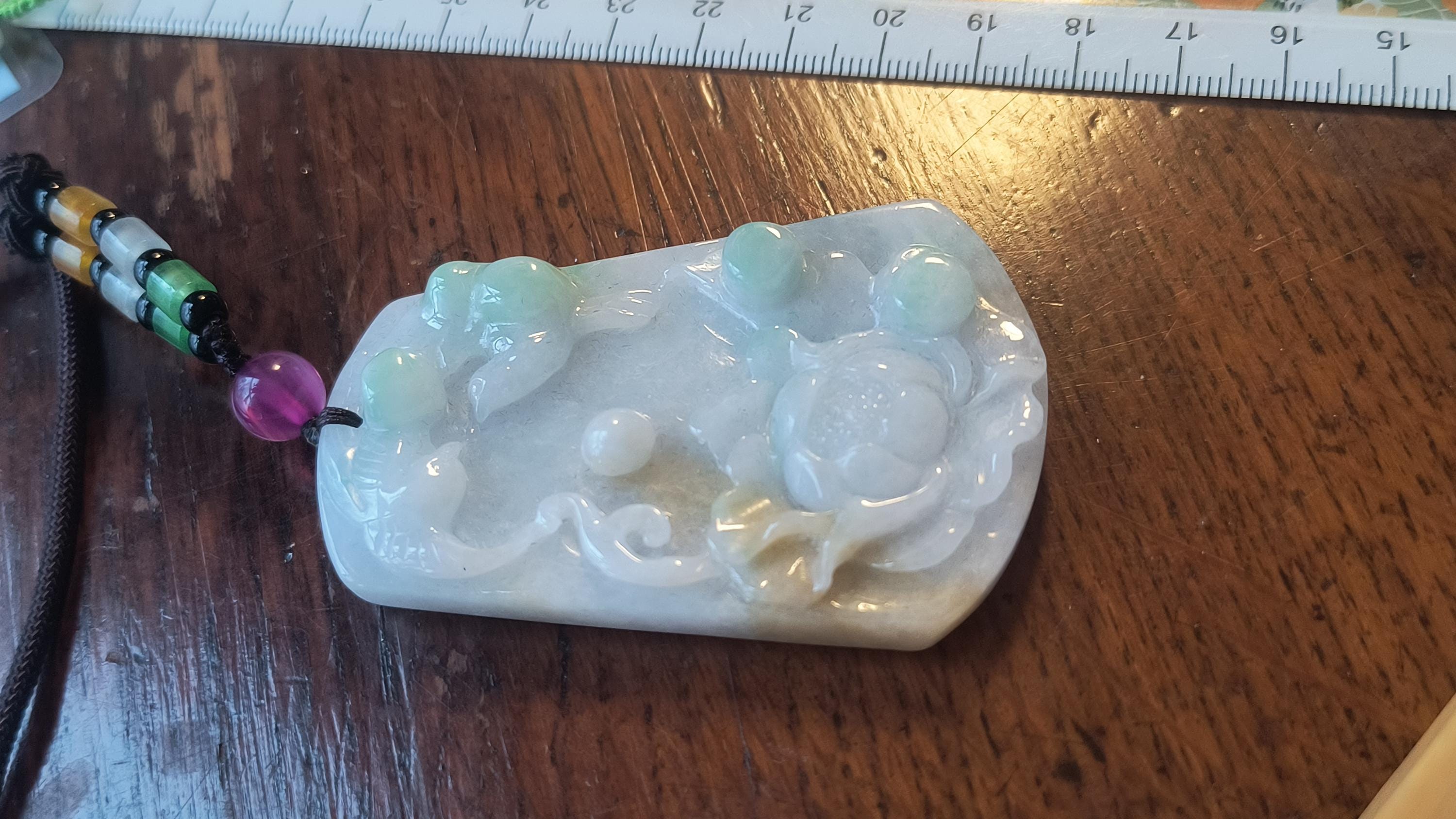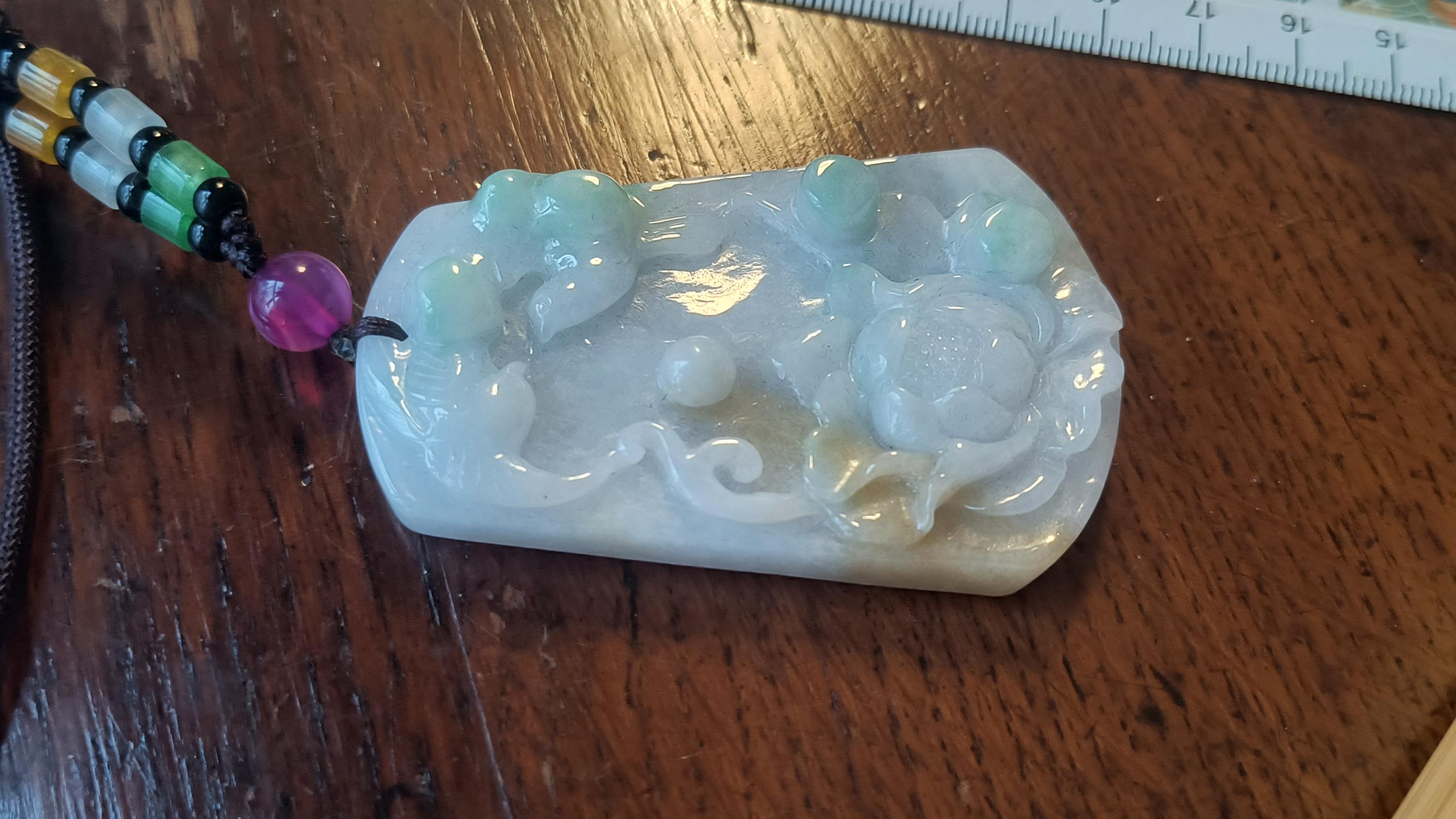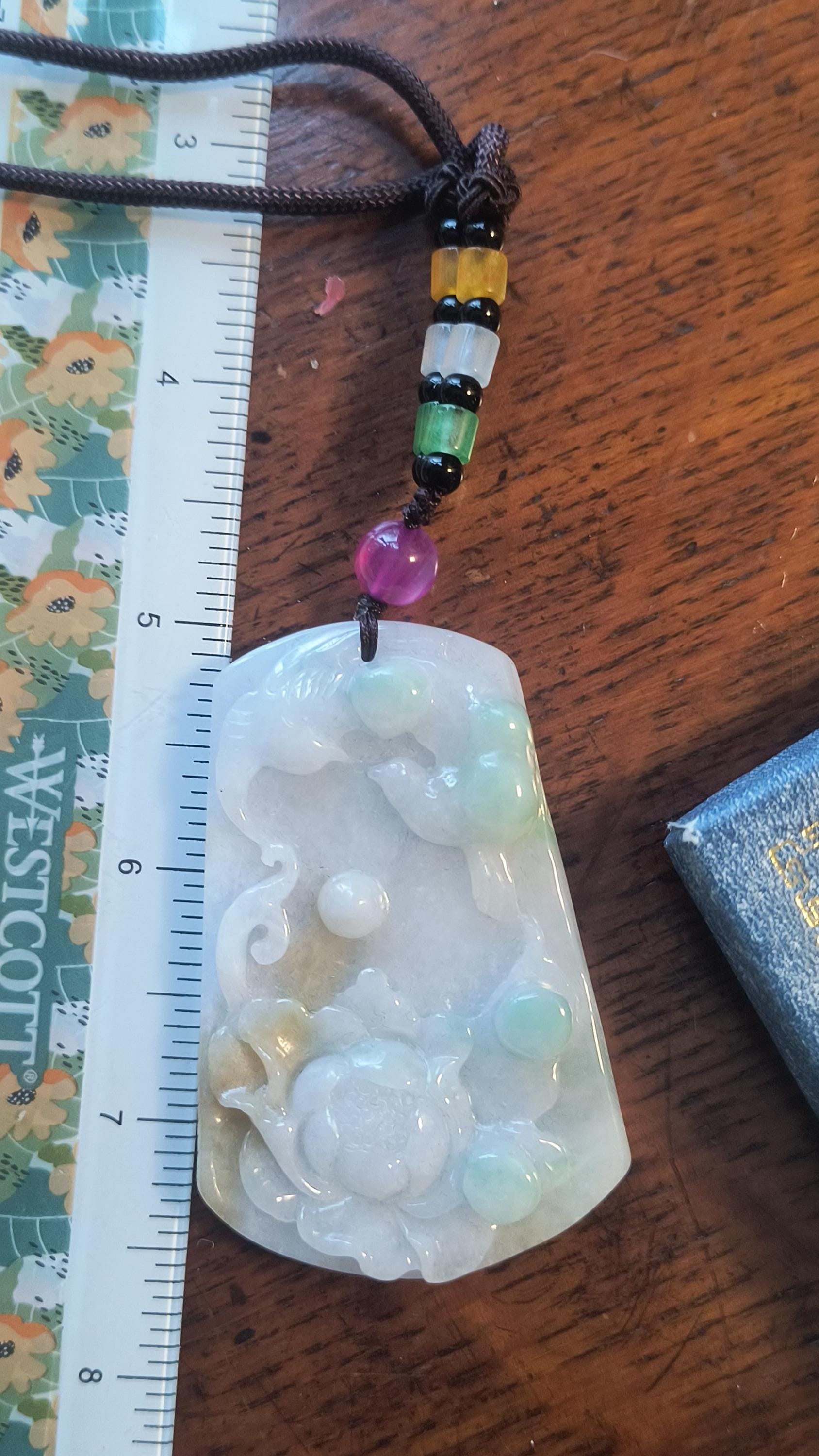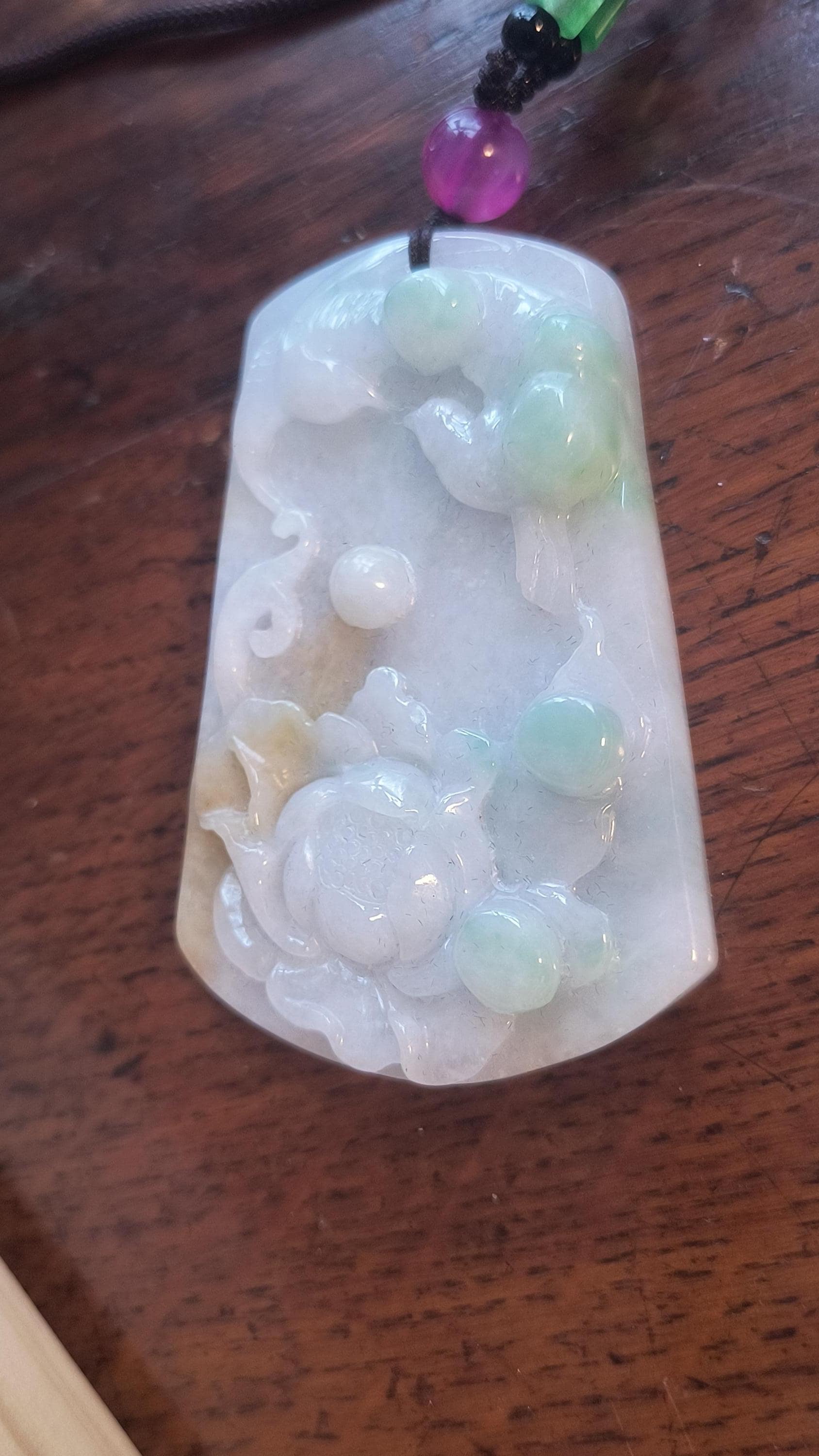 This Jade pendant was made in China, and is large enough to be displayed as an art piece when not being worn. It comes with the original certificate of authenticity. The beads the decorate the woven silk cord are also Jade, likely dyed, in bright, lucky colors.