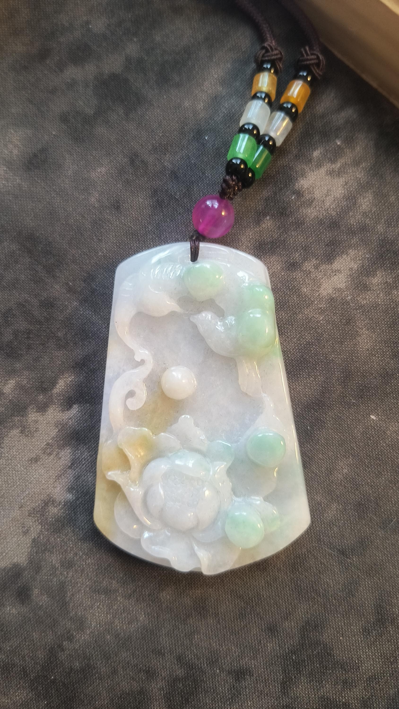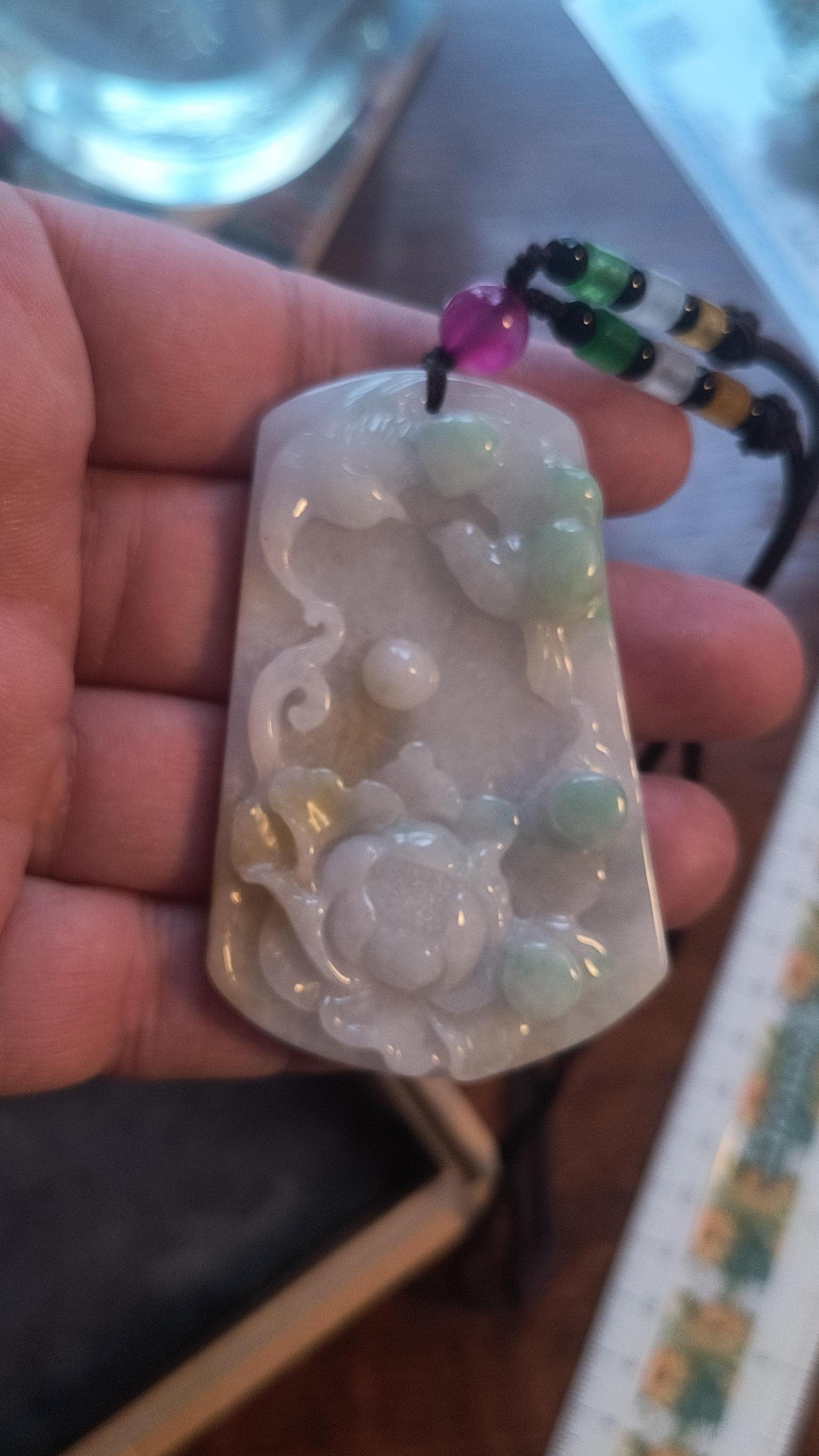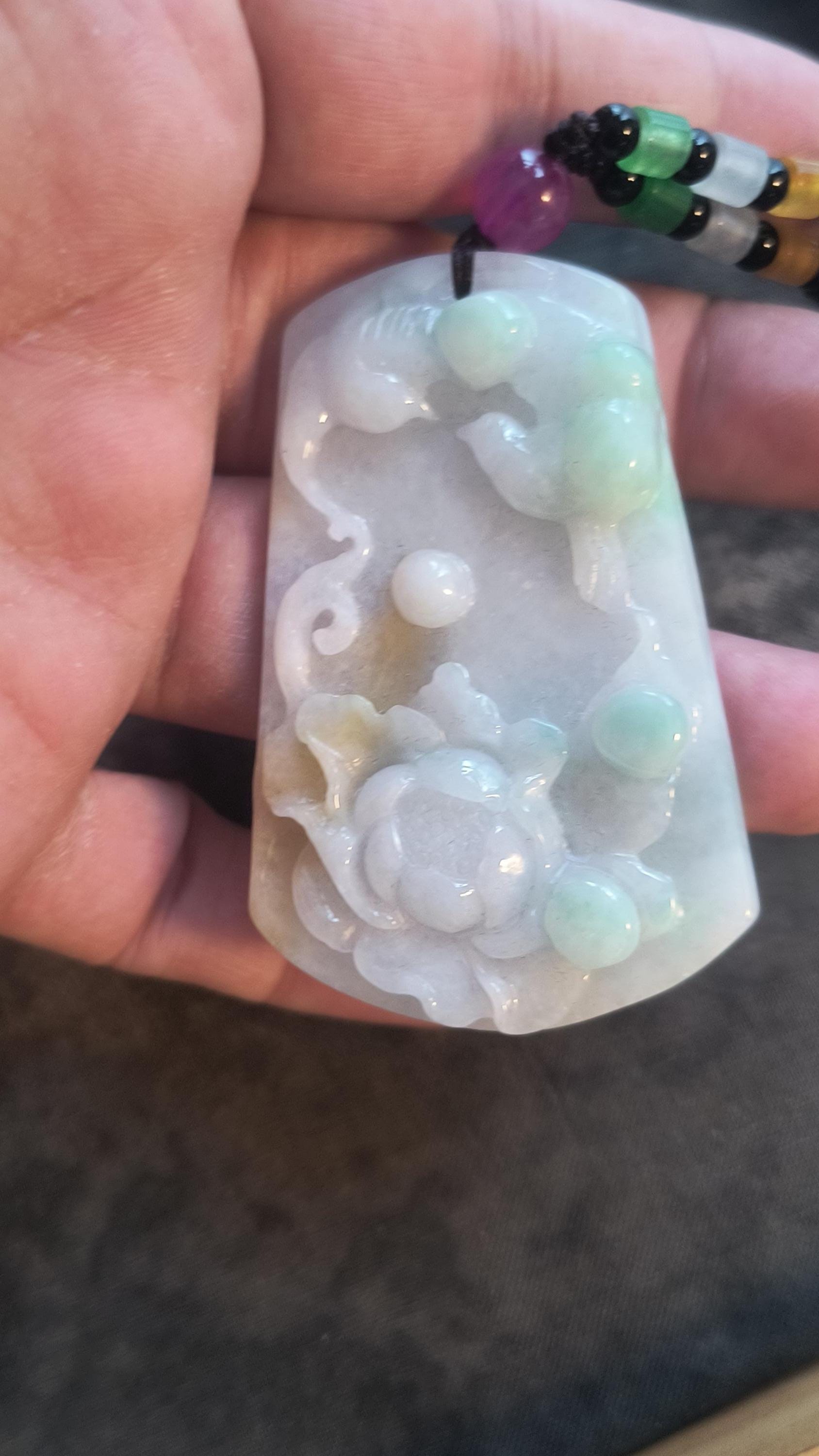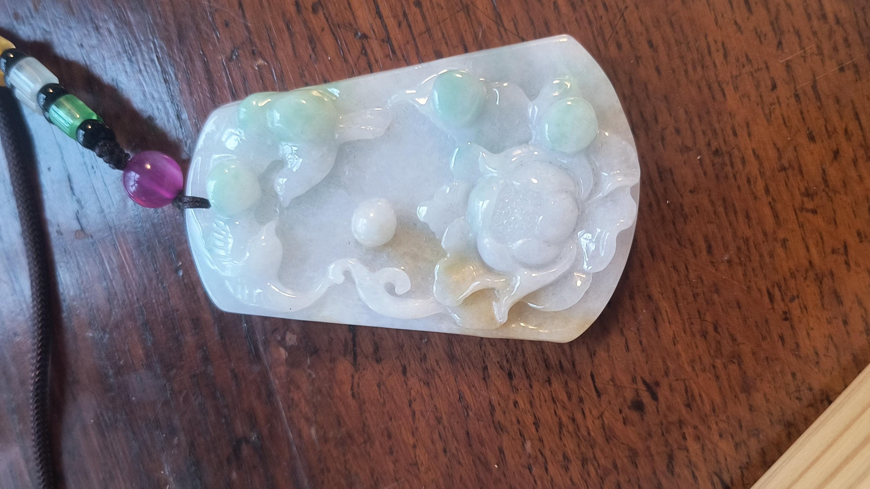 This Jade pendant was made in China, and is large enough to be displayed as an art piece when not being worn. It comes with the original certificate of authenticity. The beads the decorate the woven silk cord are also Jade, likely dyed, in bright, lucky colors.
