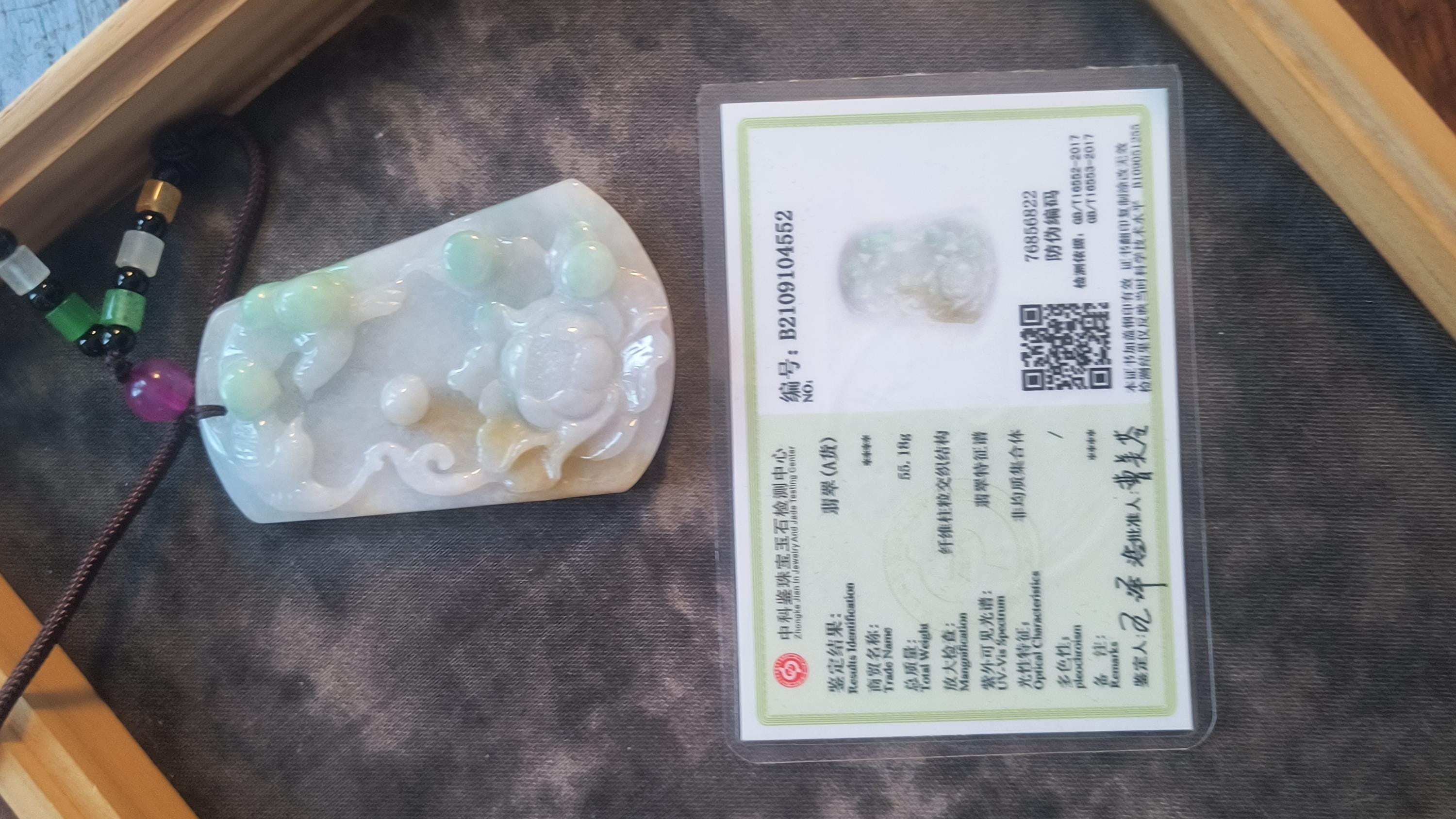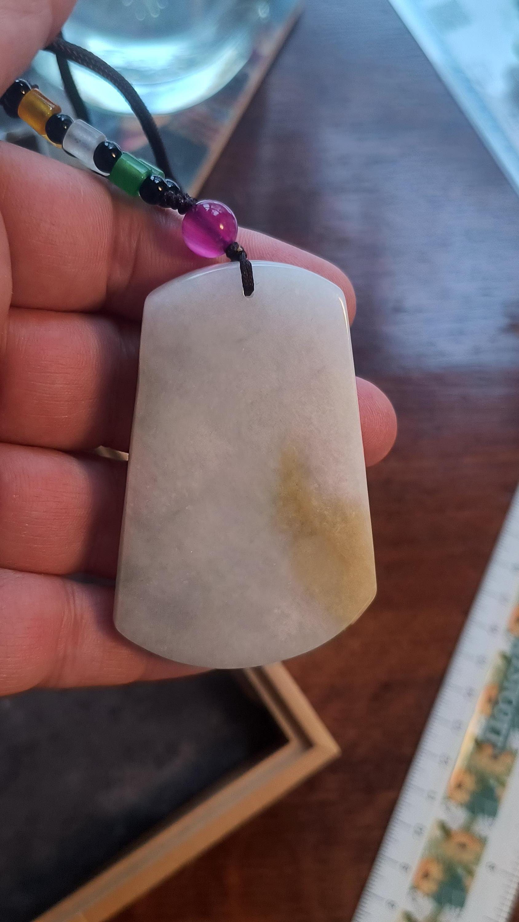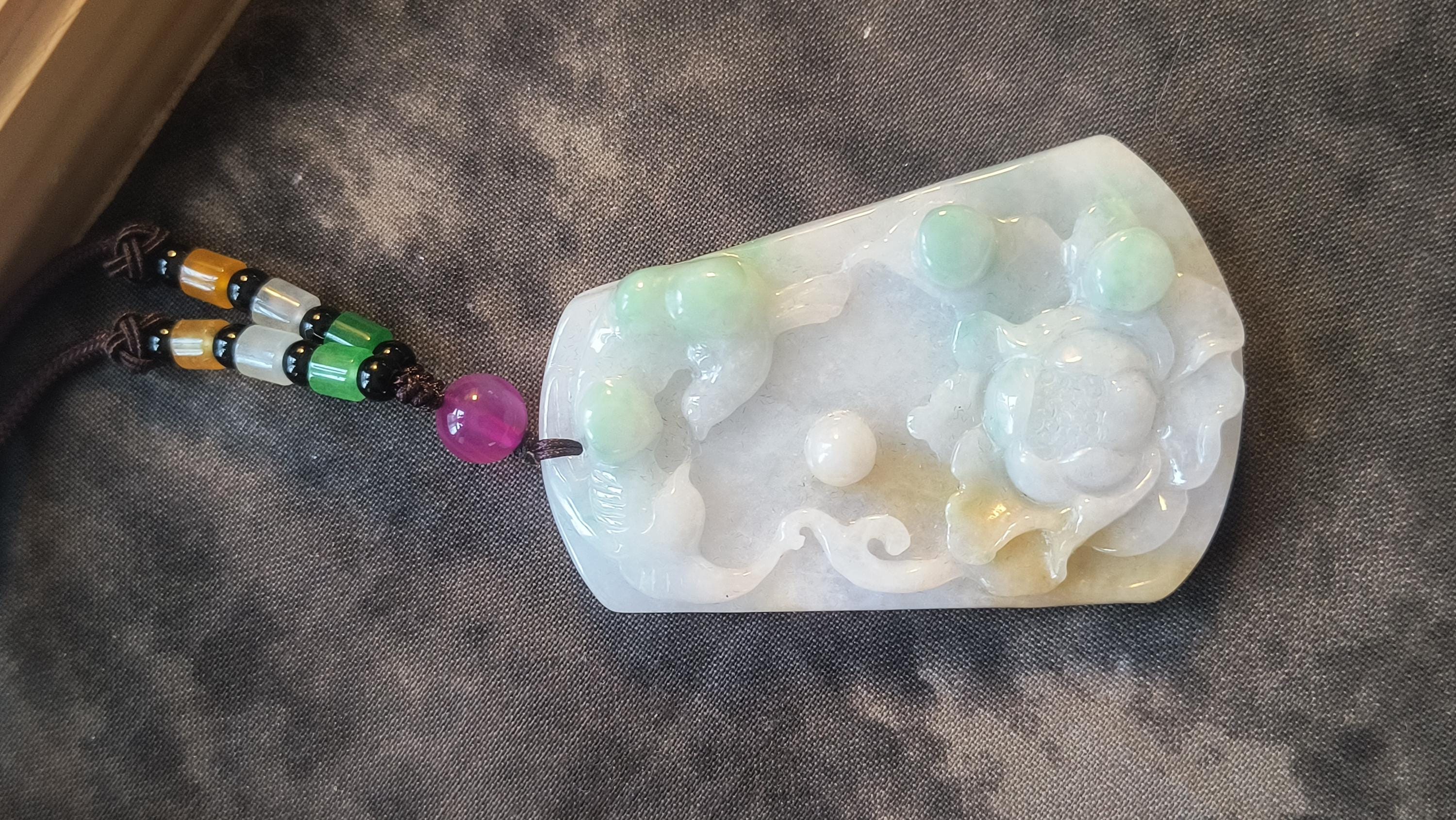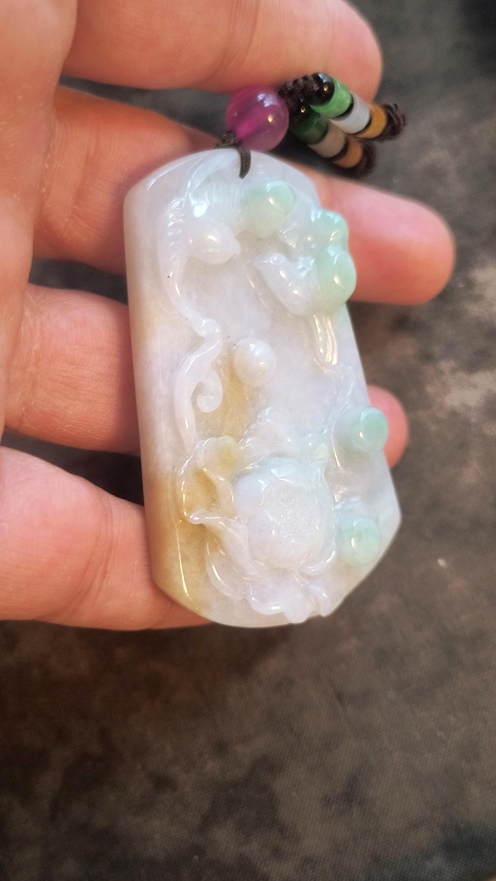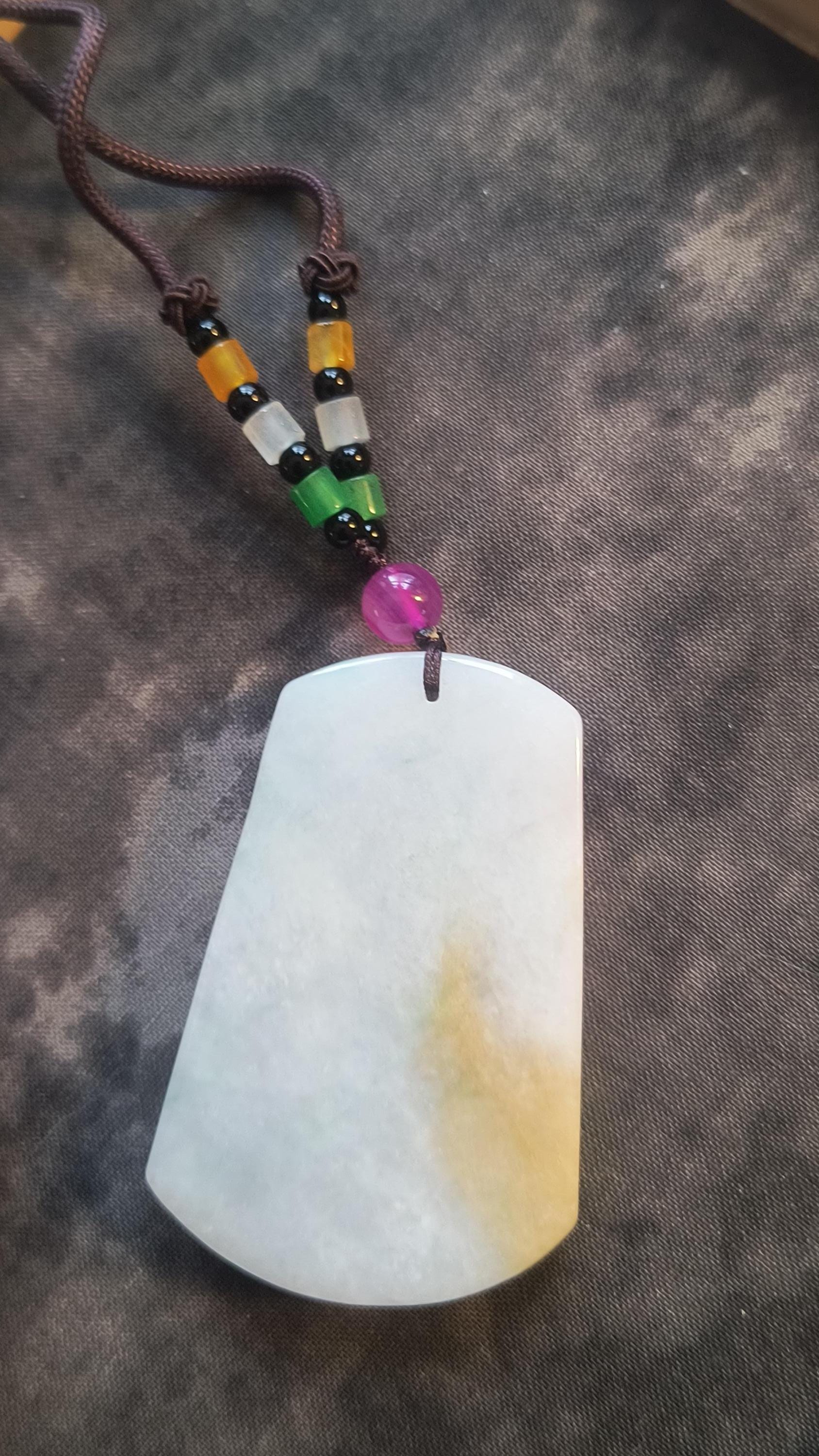This Jade pendant was made in China, and is large enough to be displayed as an art piece when not being worn. It comes with the original certificate of authenticity. The beads the decorate the woven silk cord are also Jade, likely dyed, in bright, lucky colors.