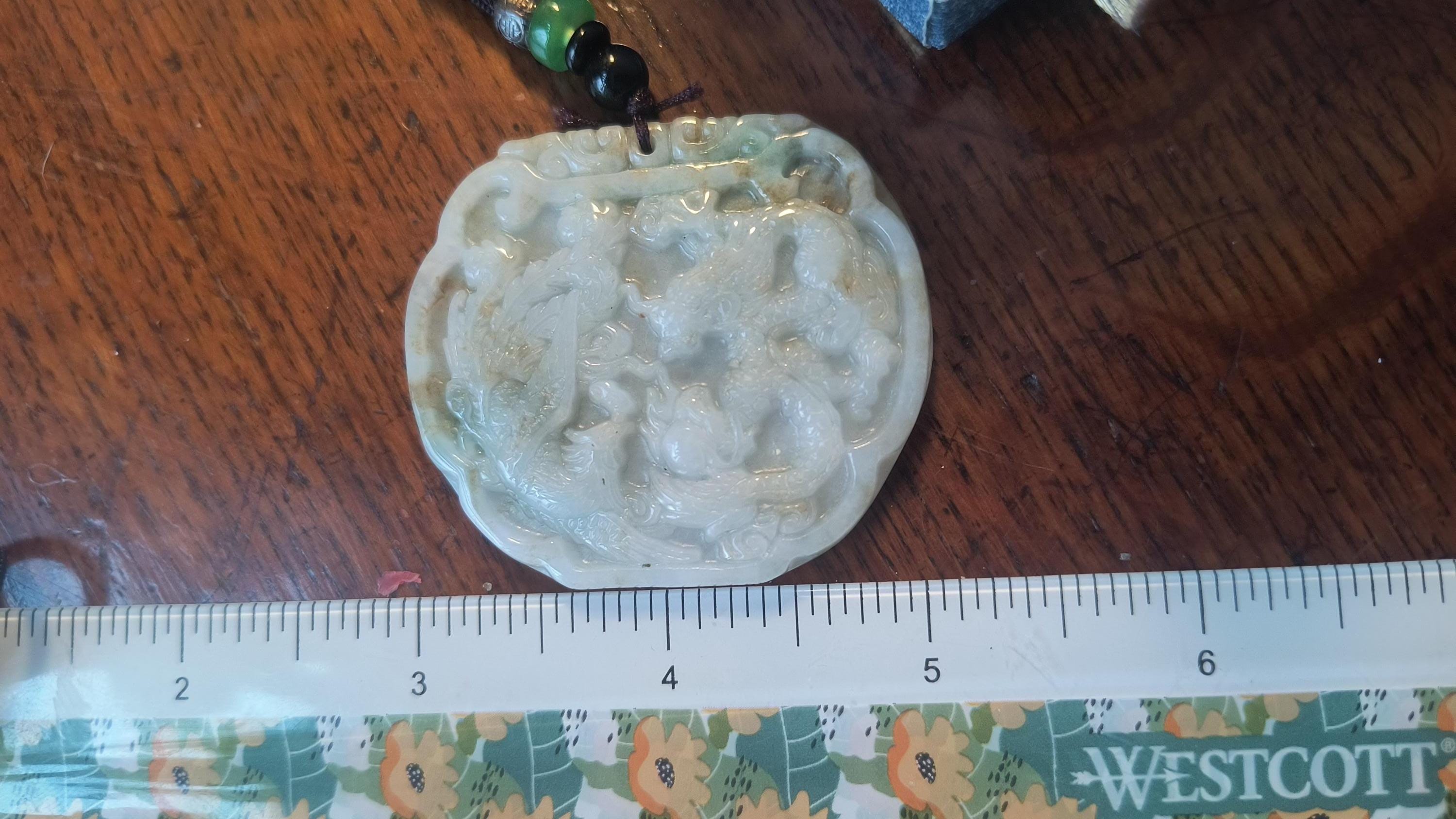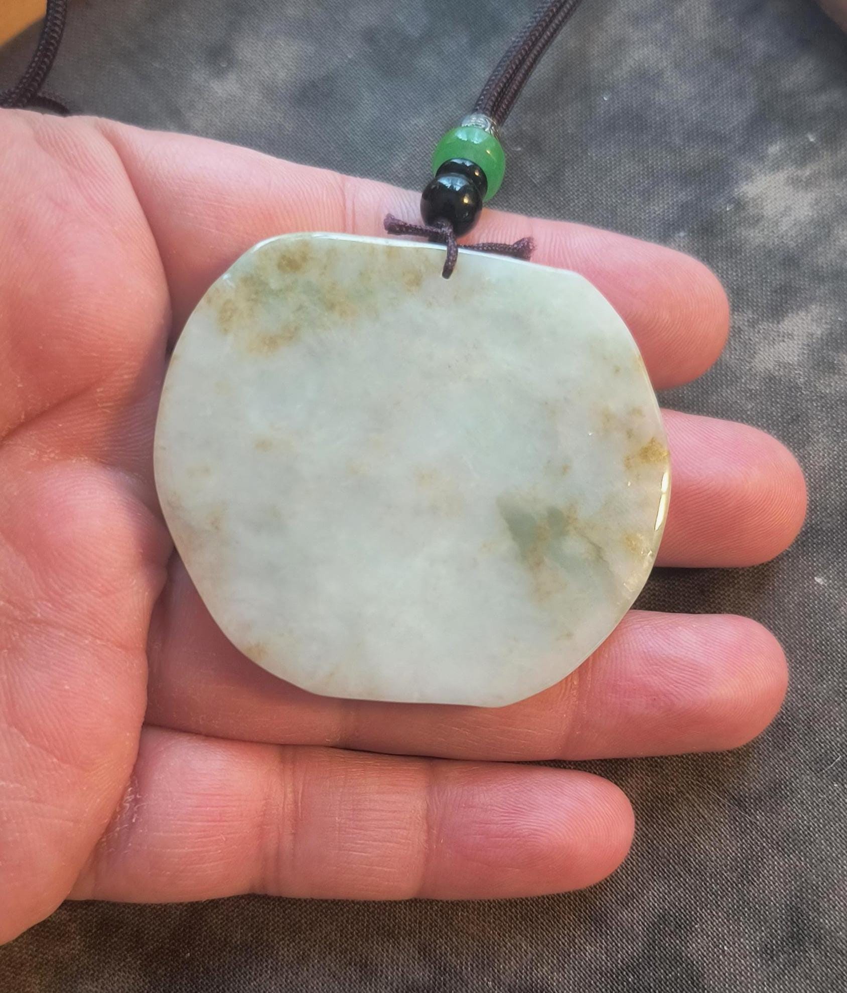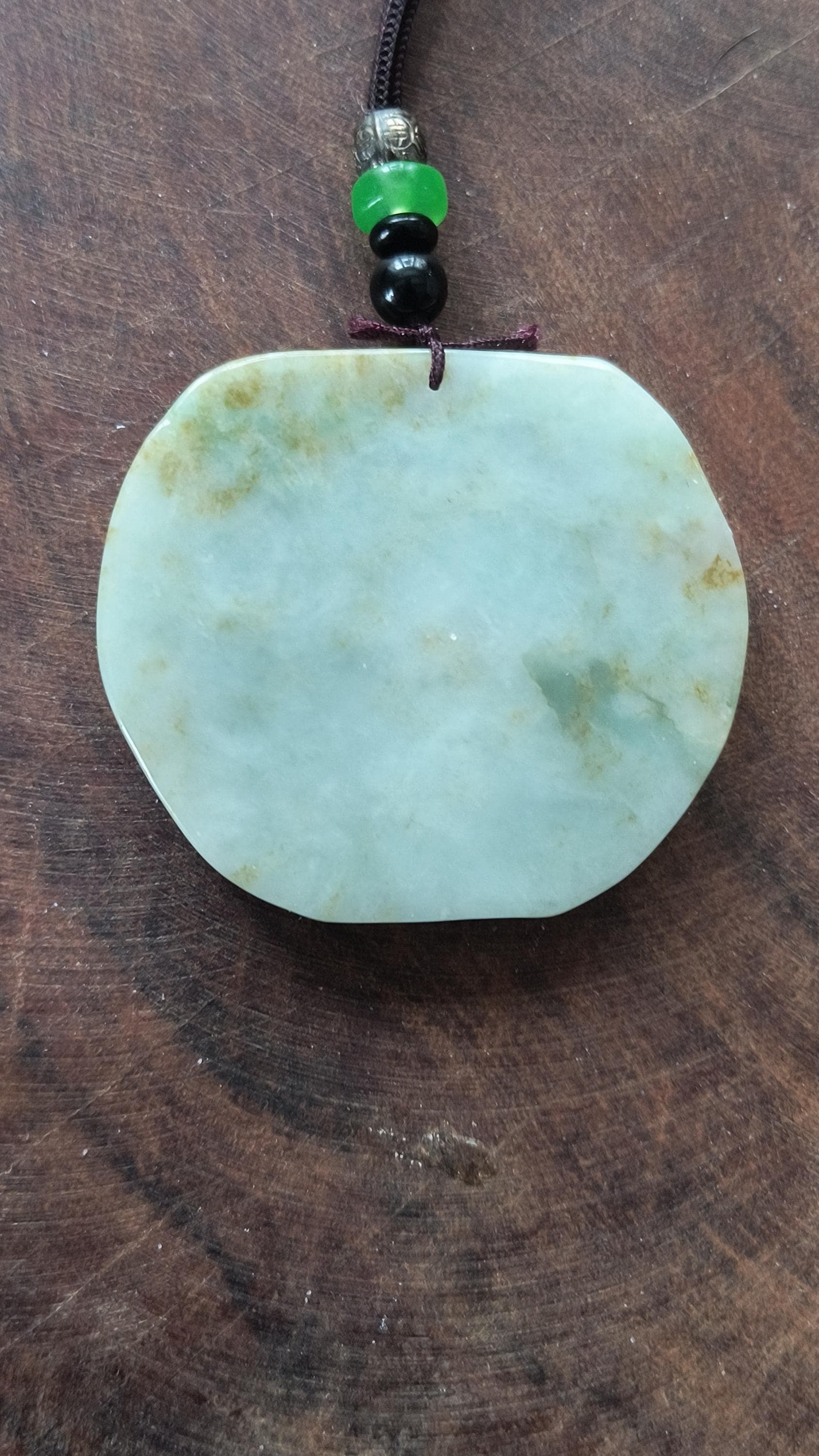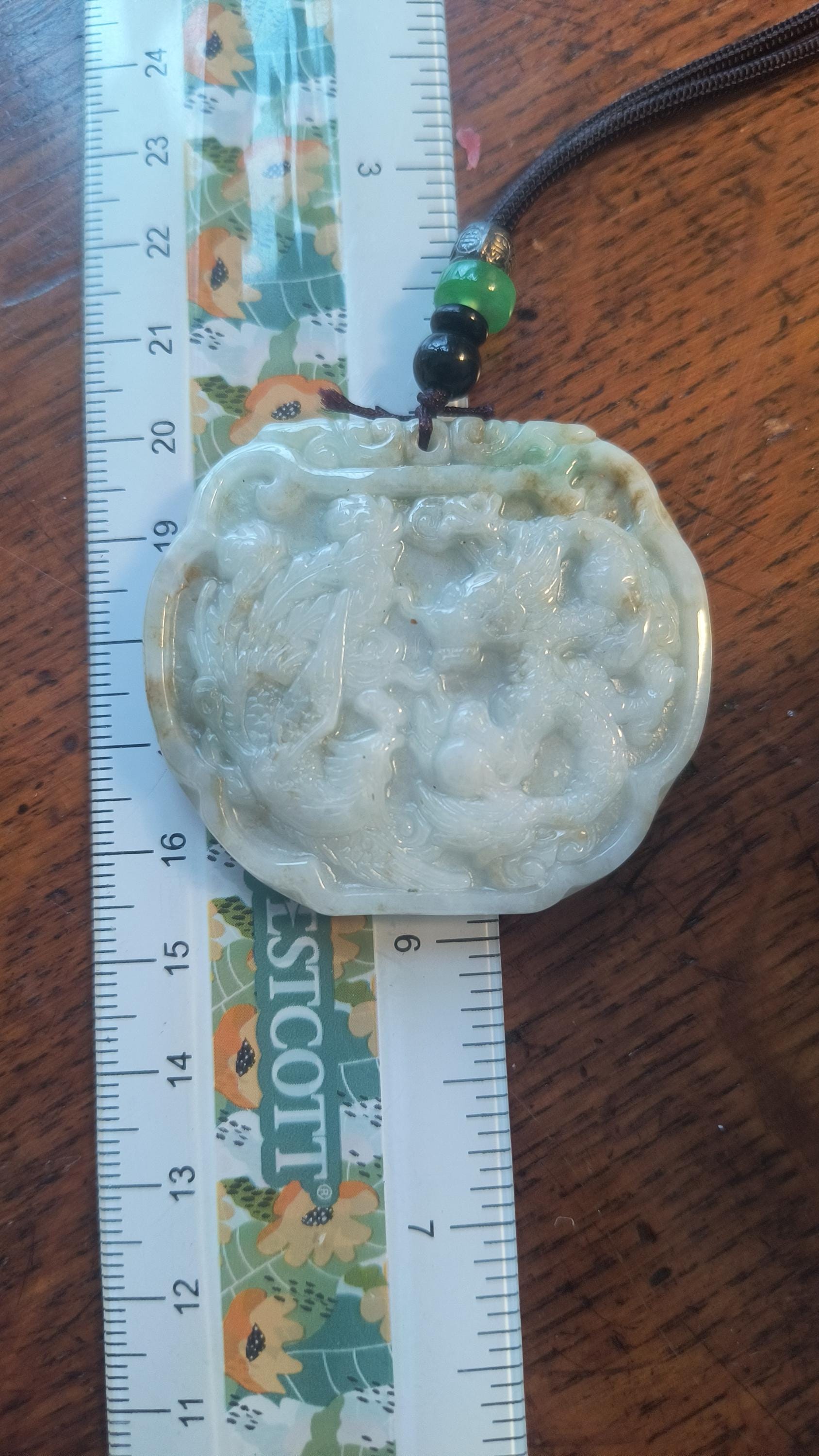 Size: 3 inches tall, 2 inches wide. Comes with woven cord measuring 20 inches and decorated with metal and Jade beads.