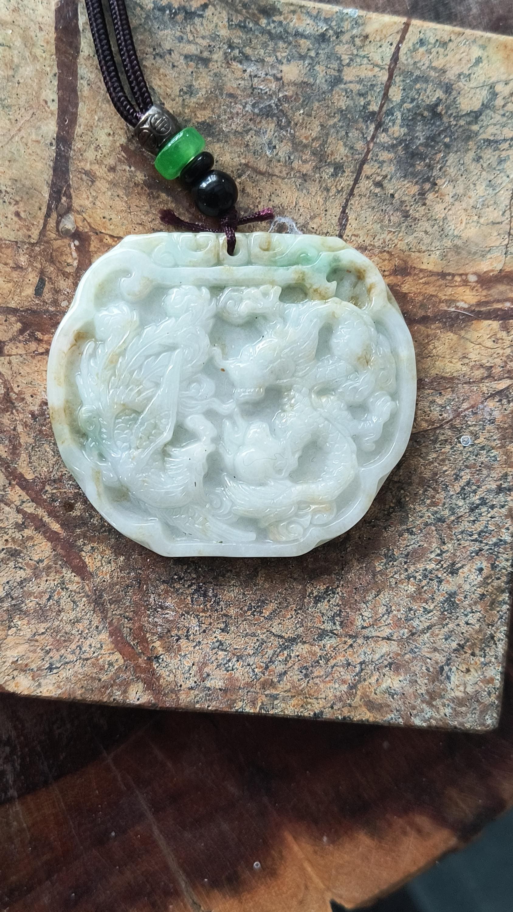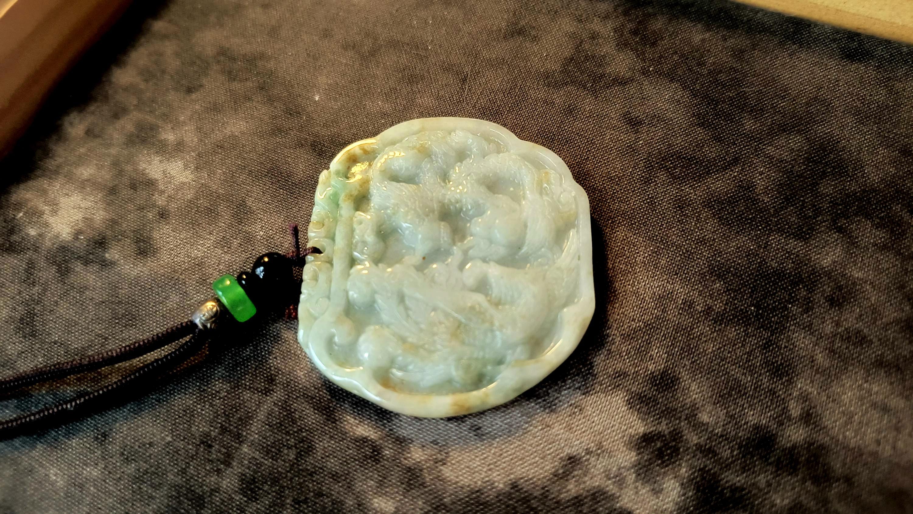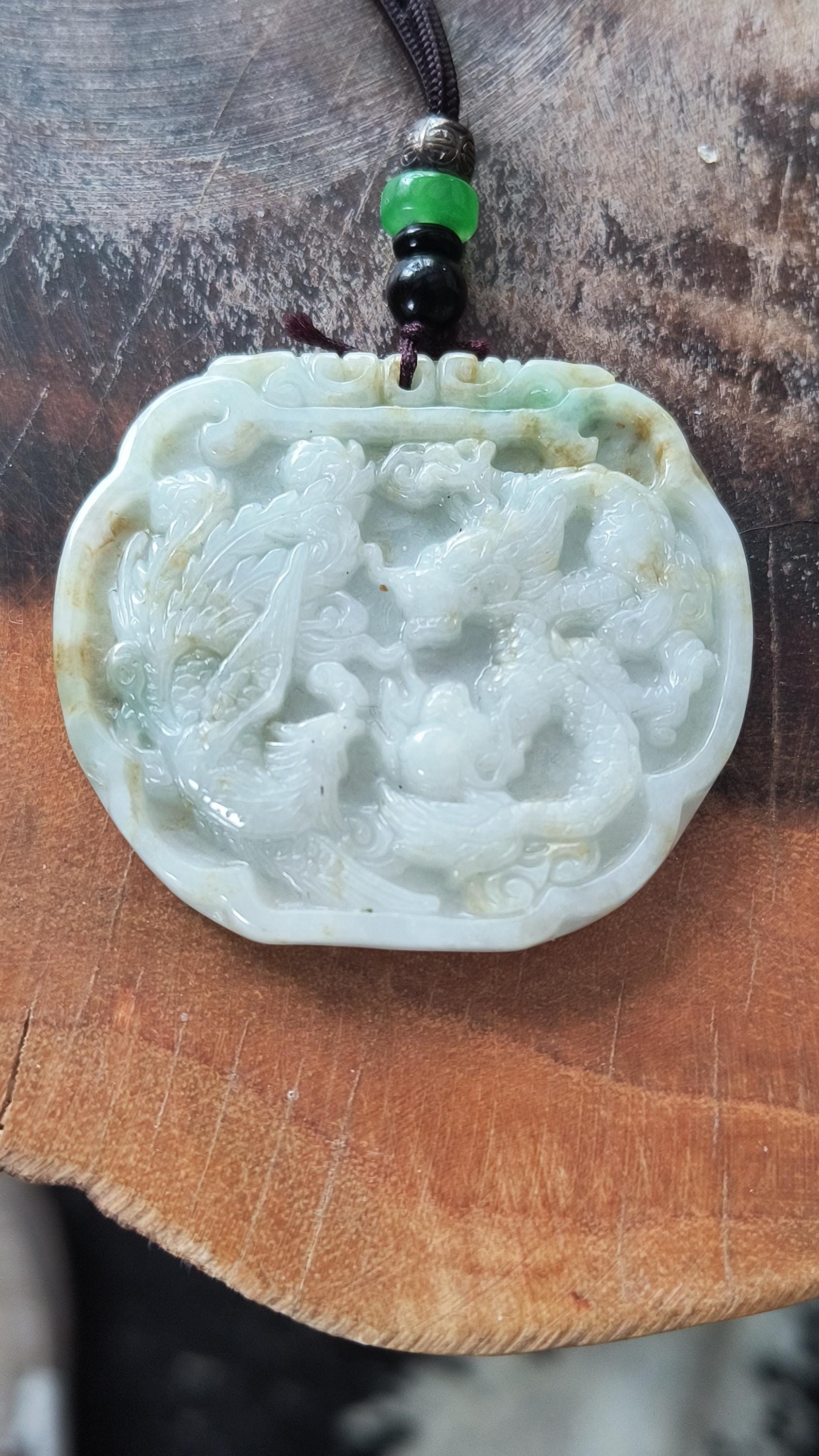 Size: 3 inches tall, 2 inches wide. Comes with woven cord measuring 20 inches and decorated with metal and Jade beads.