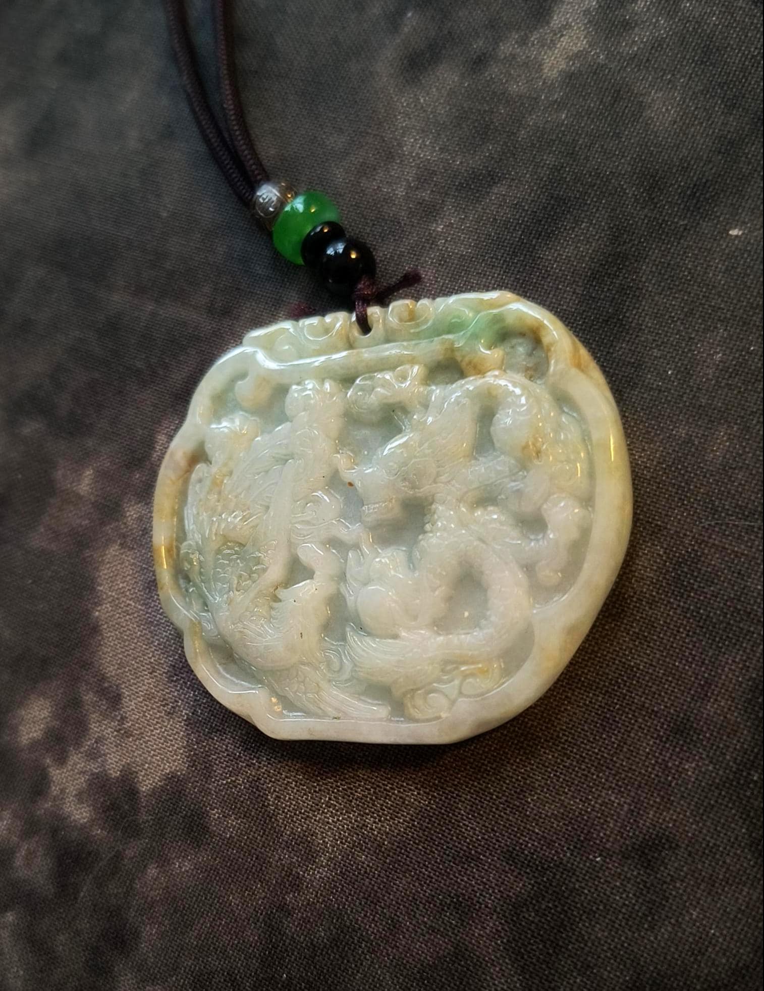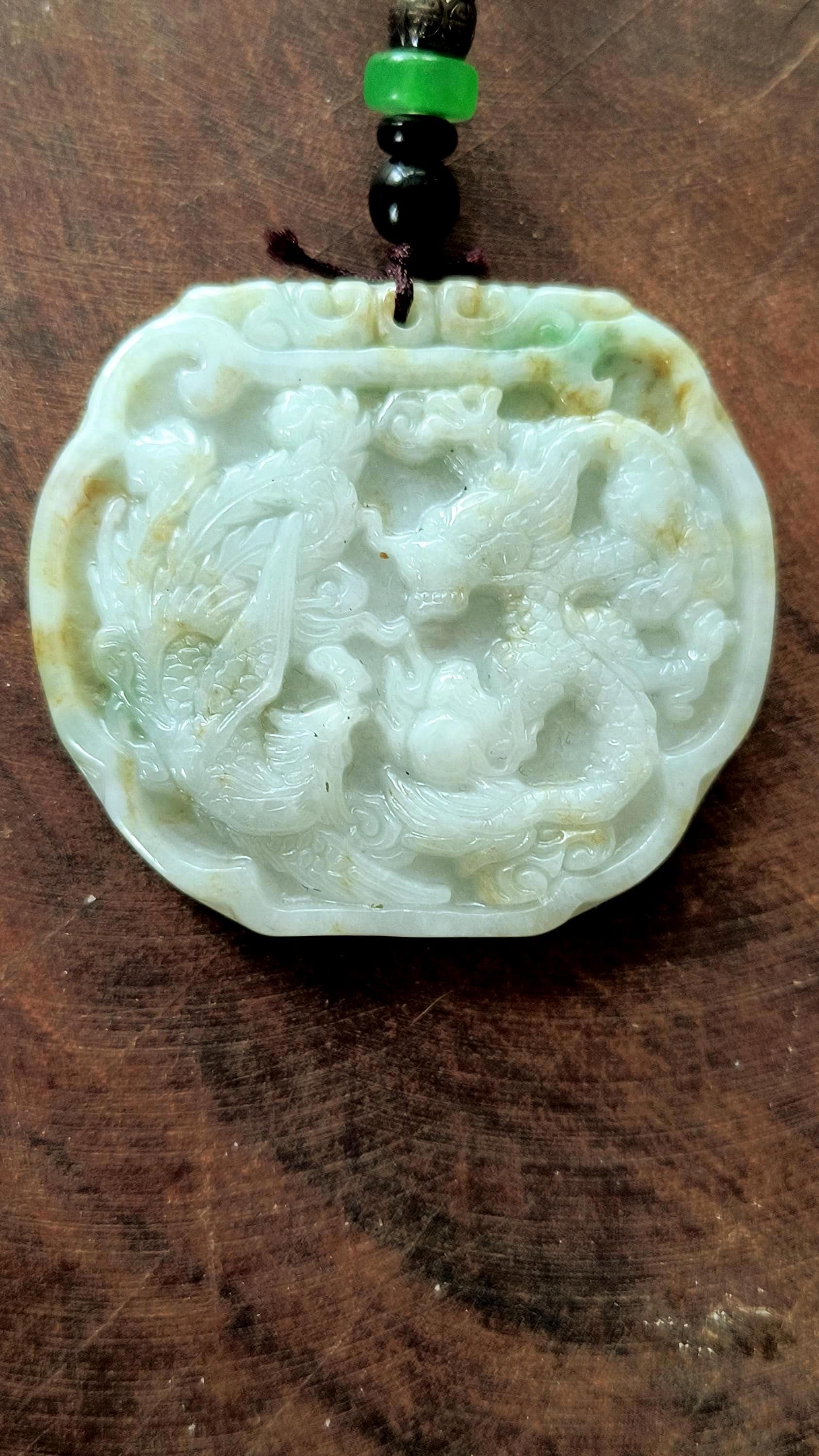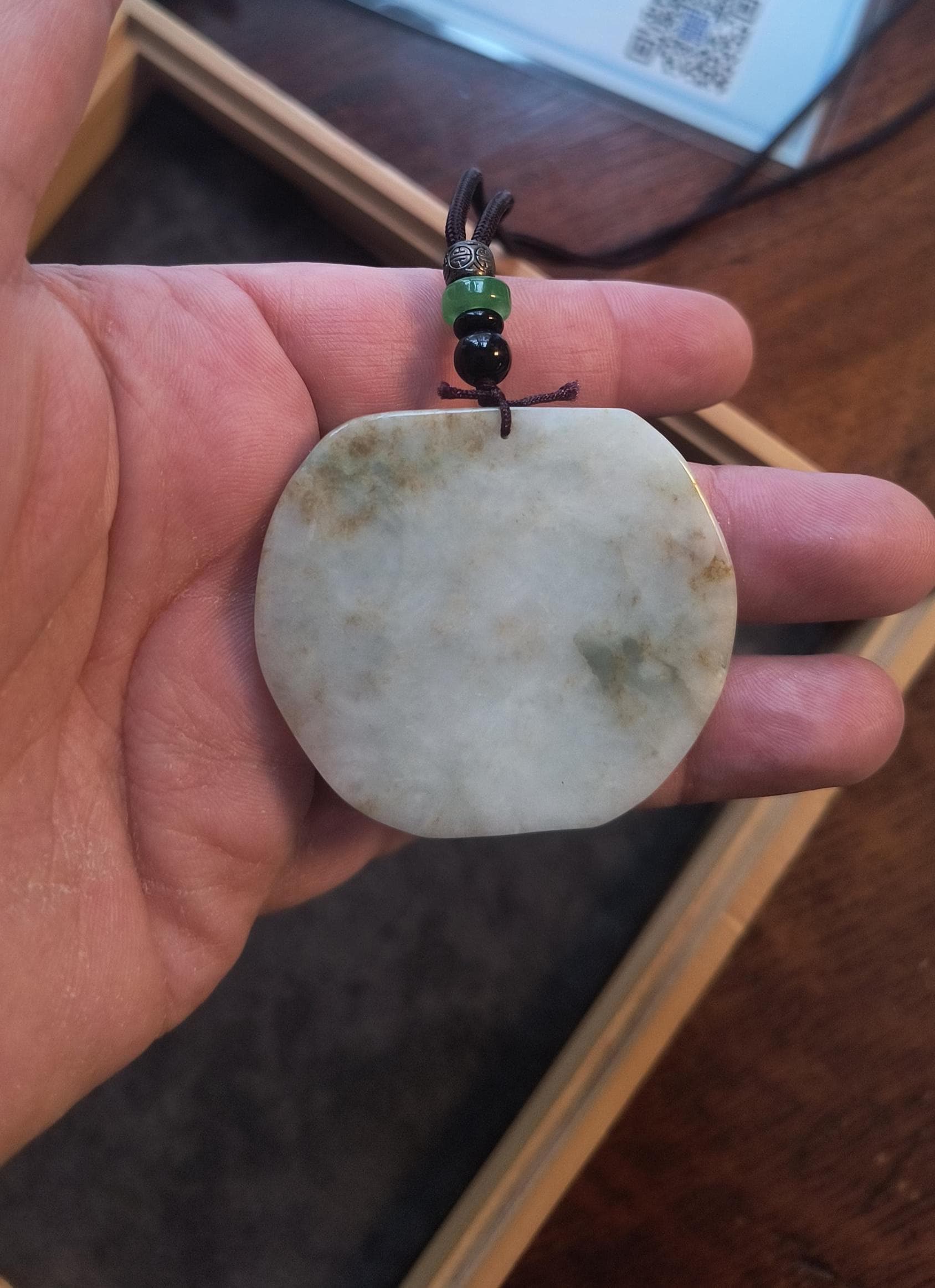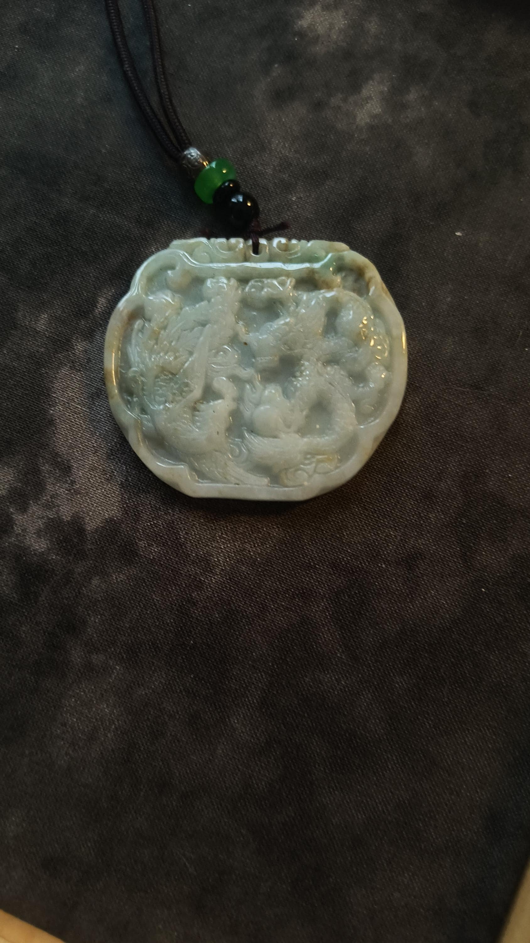 Size: 3 inches tall, 2 inches wide. Comes with woven cord measuring 20 inches and decorated with metal and Jade beads.