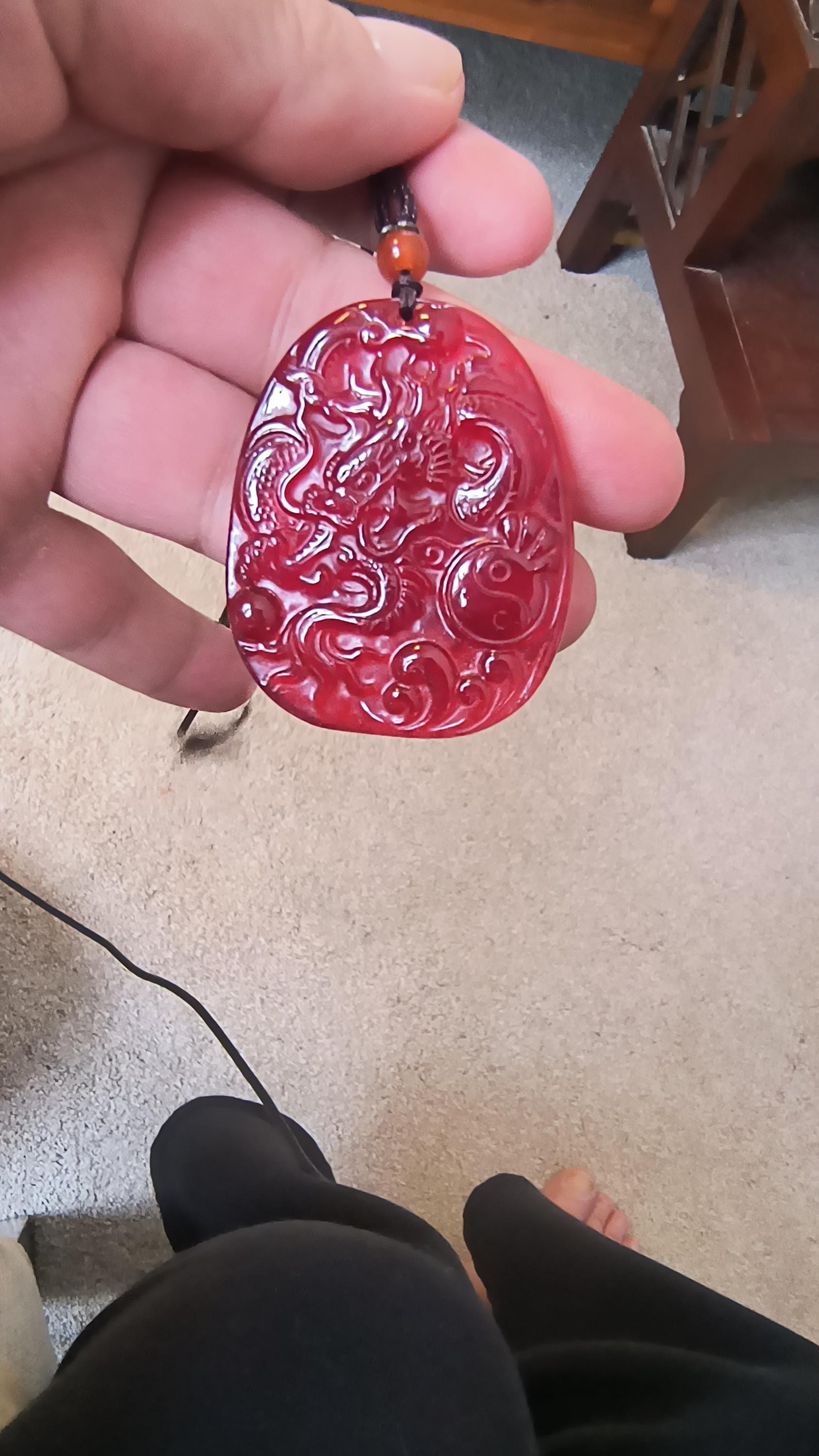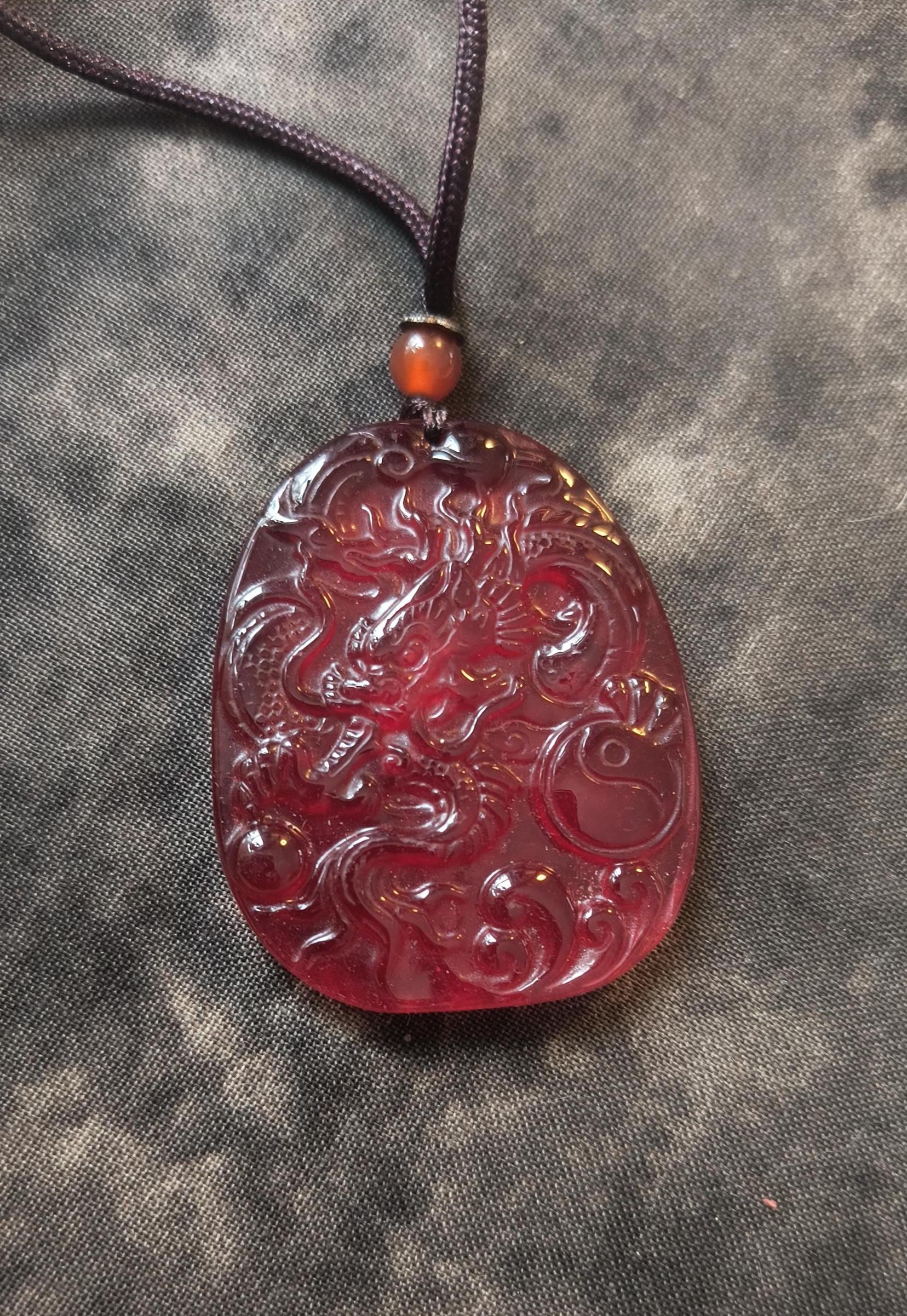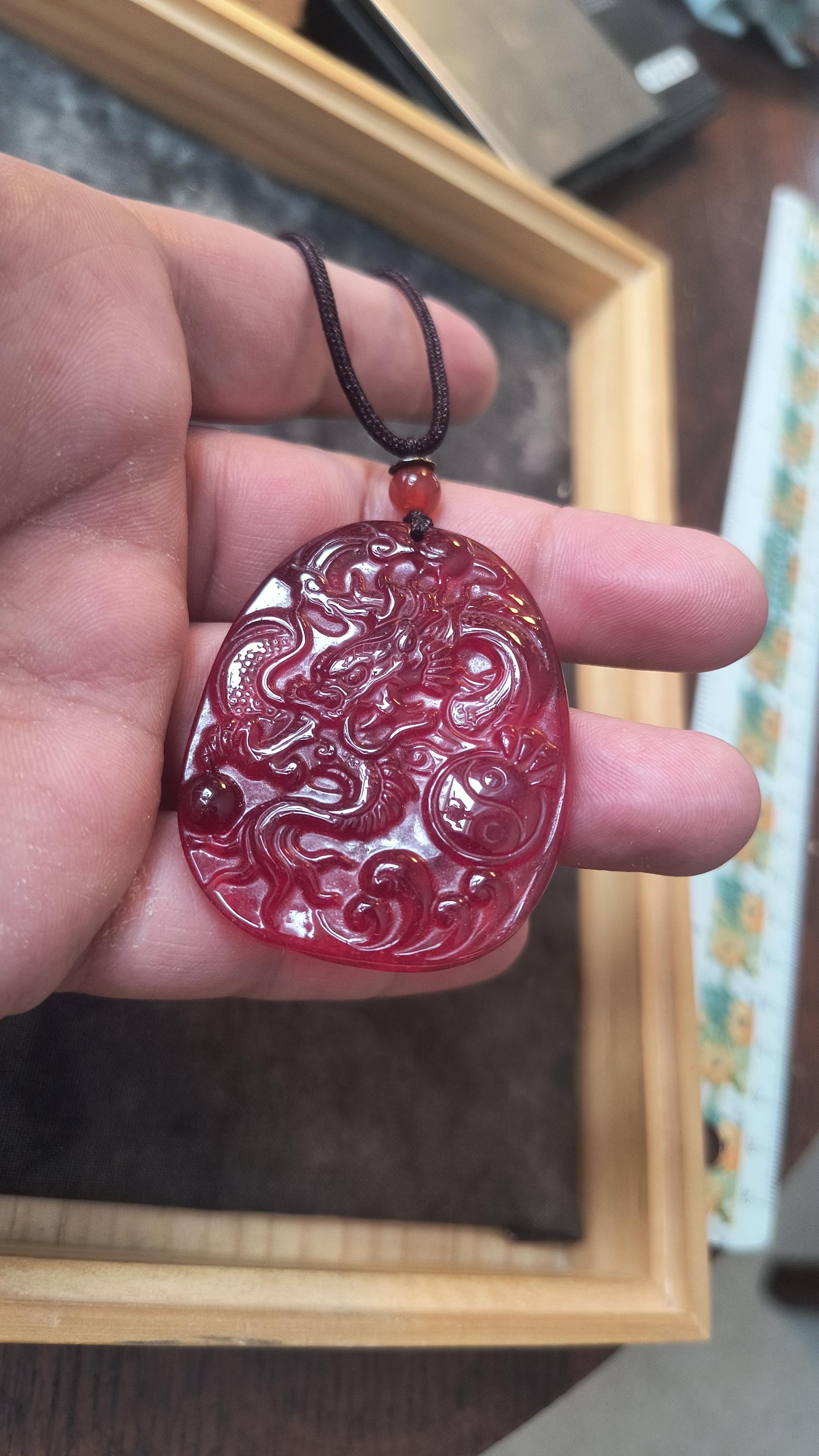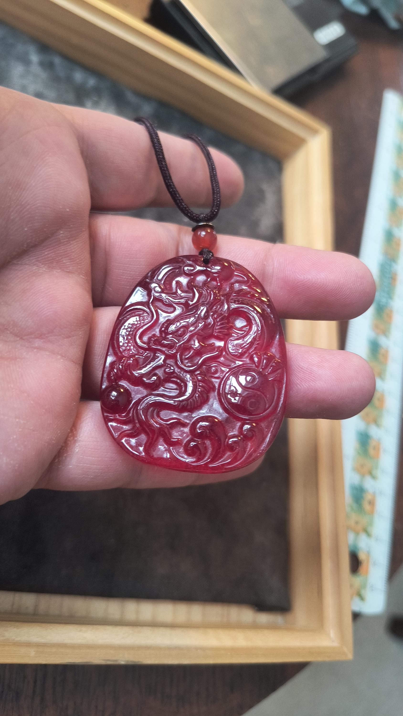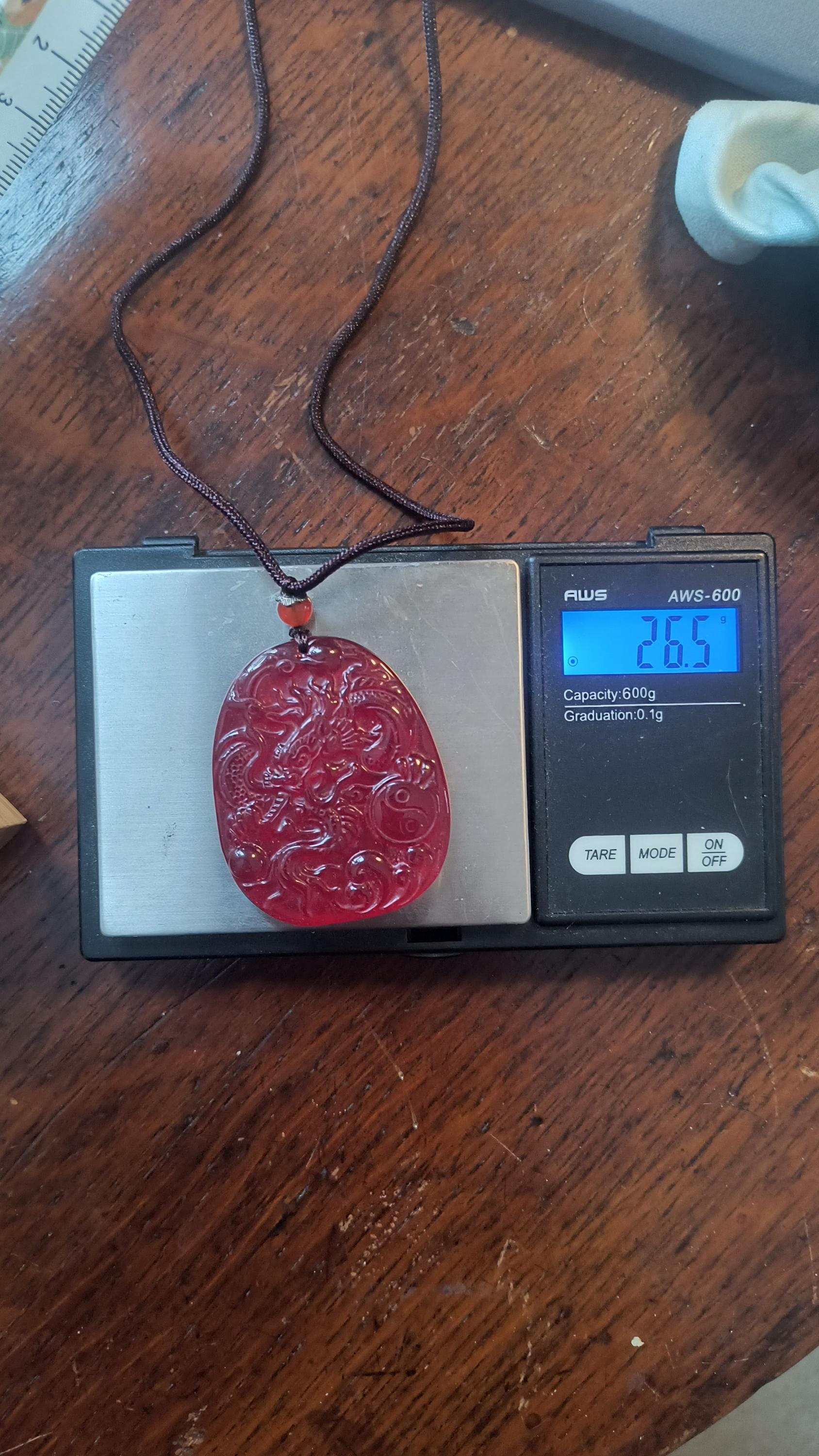 A dragon chasing a flaming Pearl across the sky is a symbol of good luck, prosperity and especially wisdom and spiritual energy. Here the scene is carved in red Jadeite, called "Ice Jade" for it's translucency and clarity.