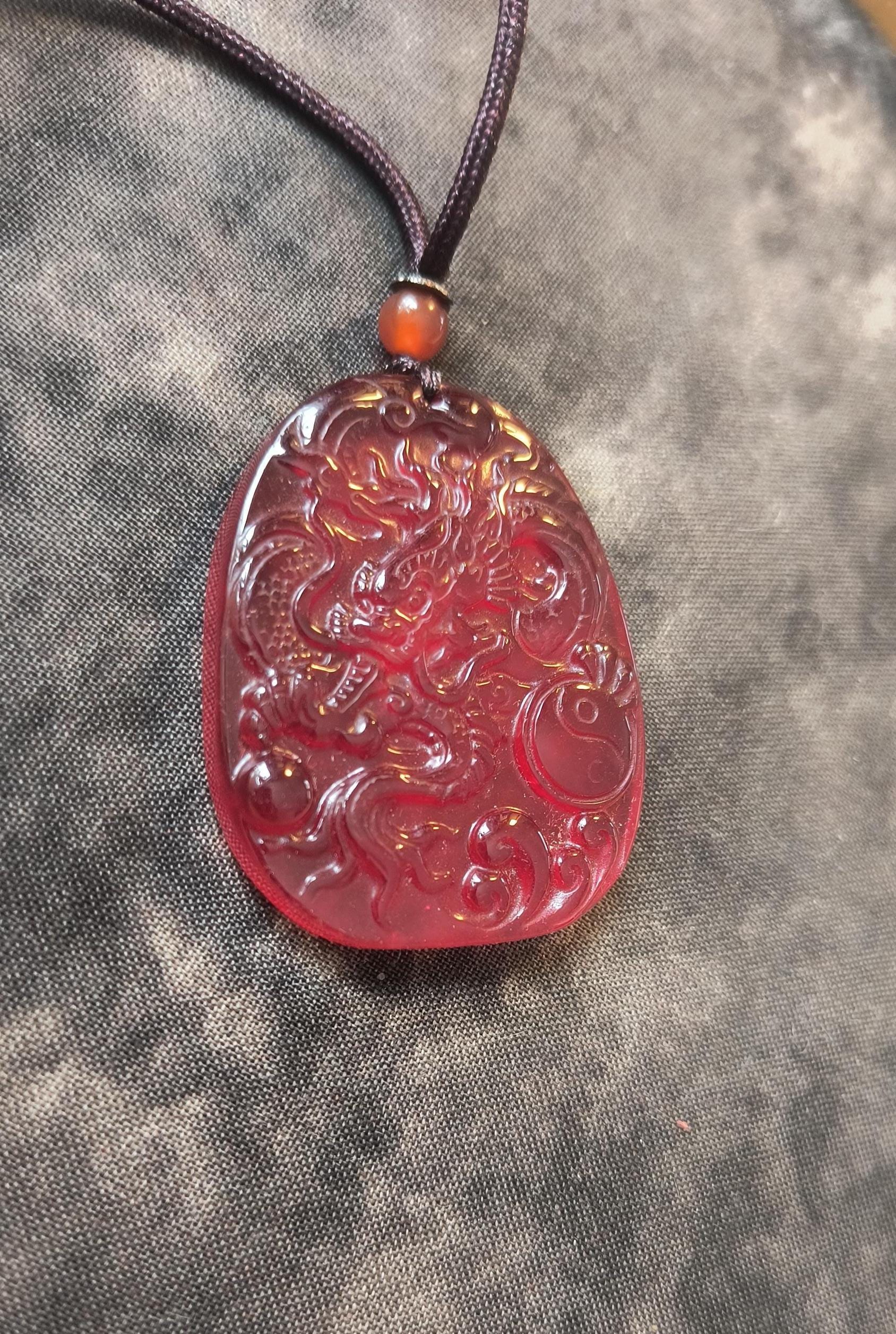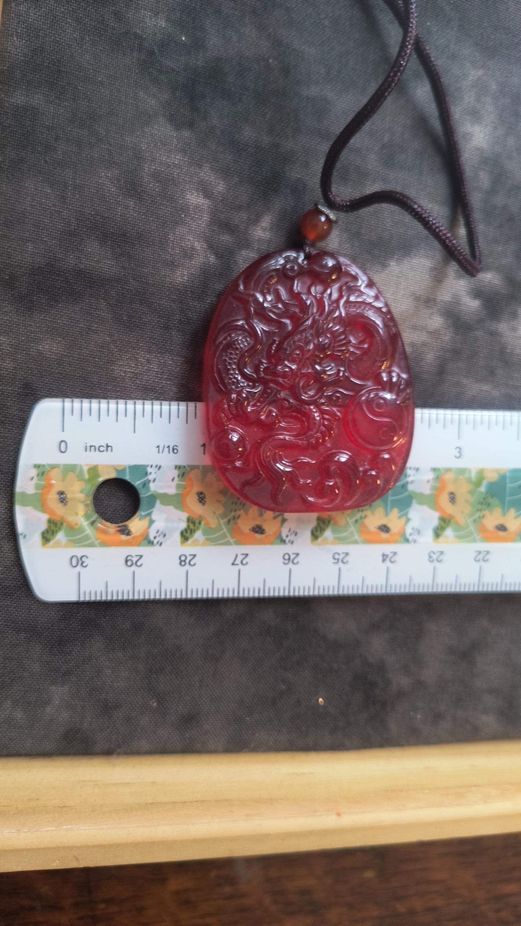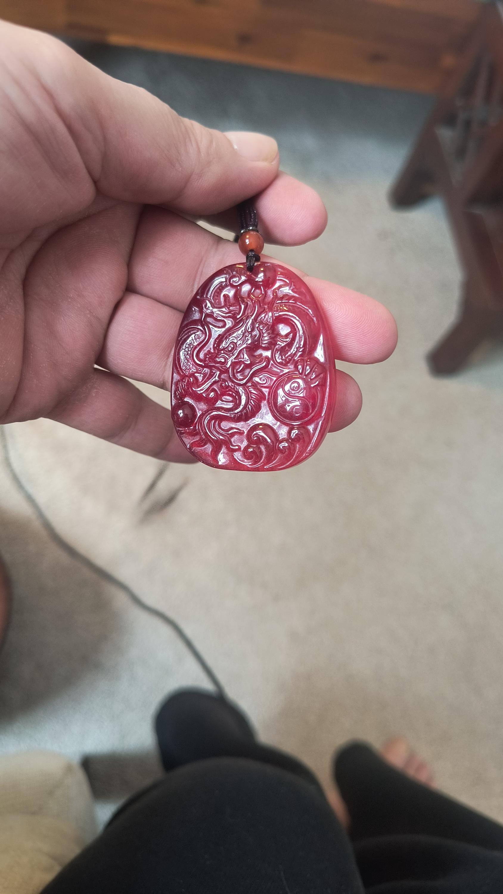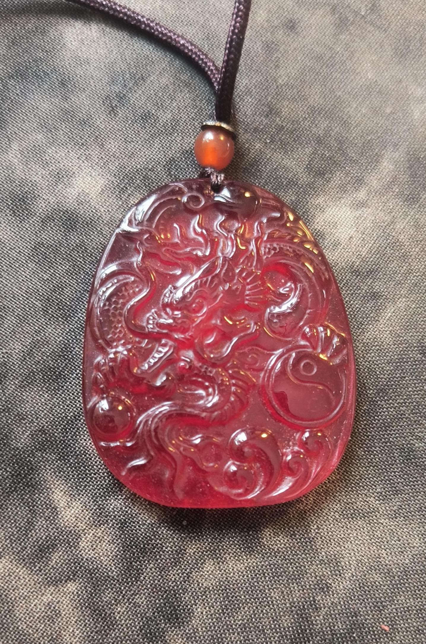 A dragon chasing a flaming Pearl across the sky is a symbol of good luck, prosperity and especially wisdom and spiritual energy. Here the scene is carved in red Jadeite, called "Ice Jade" for it's translucency and clarity.