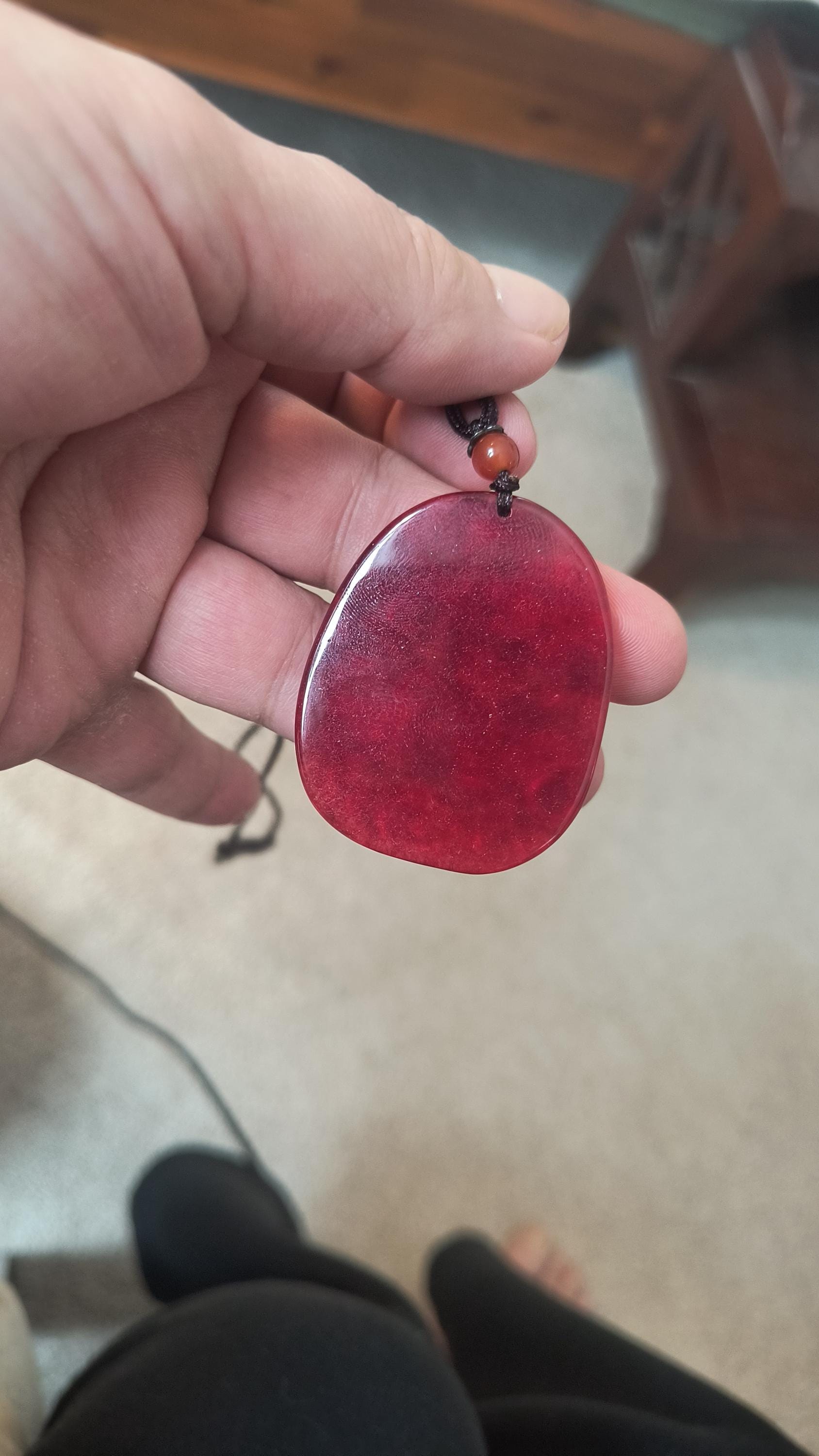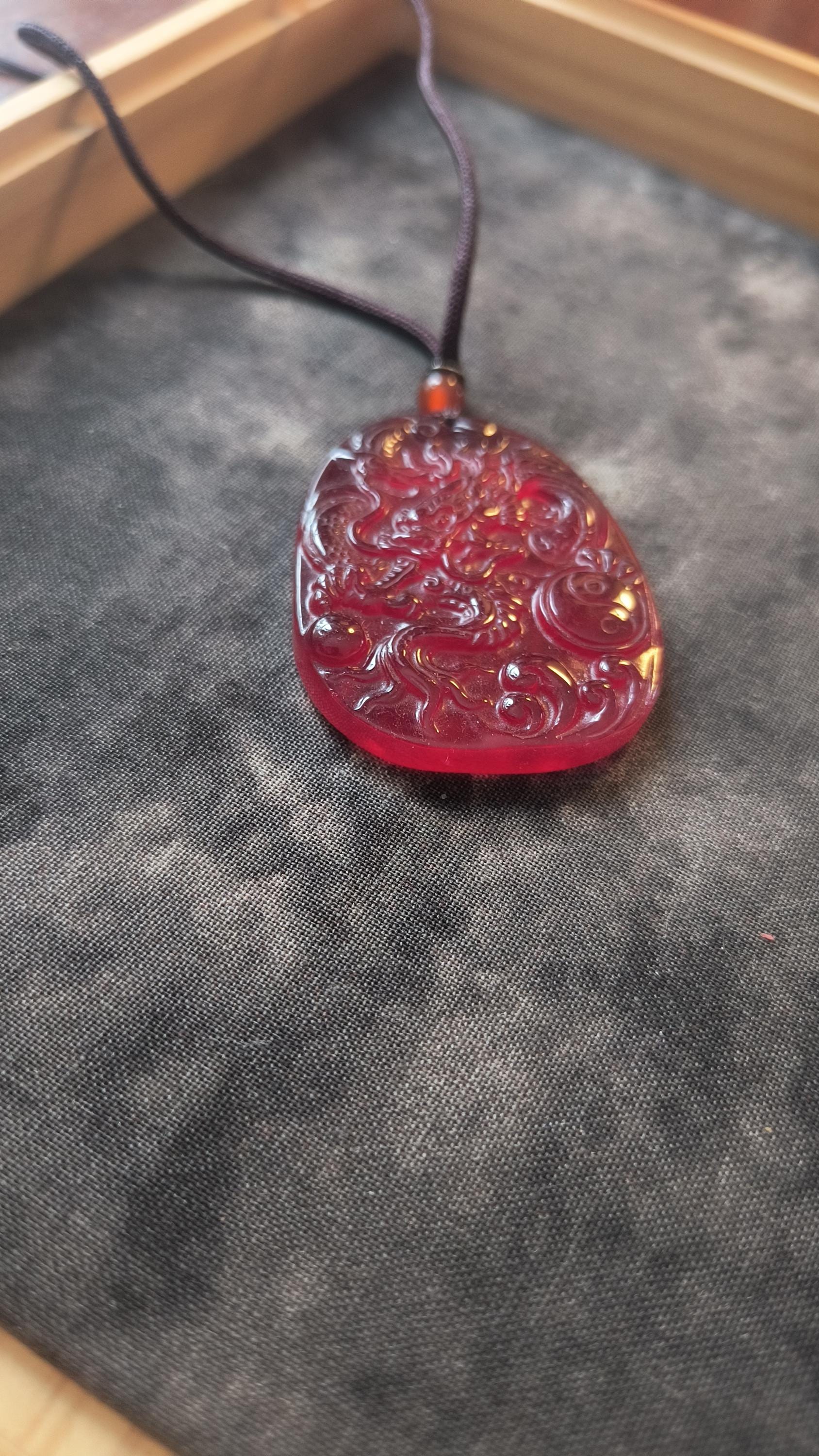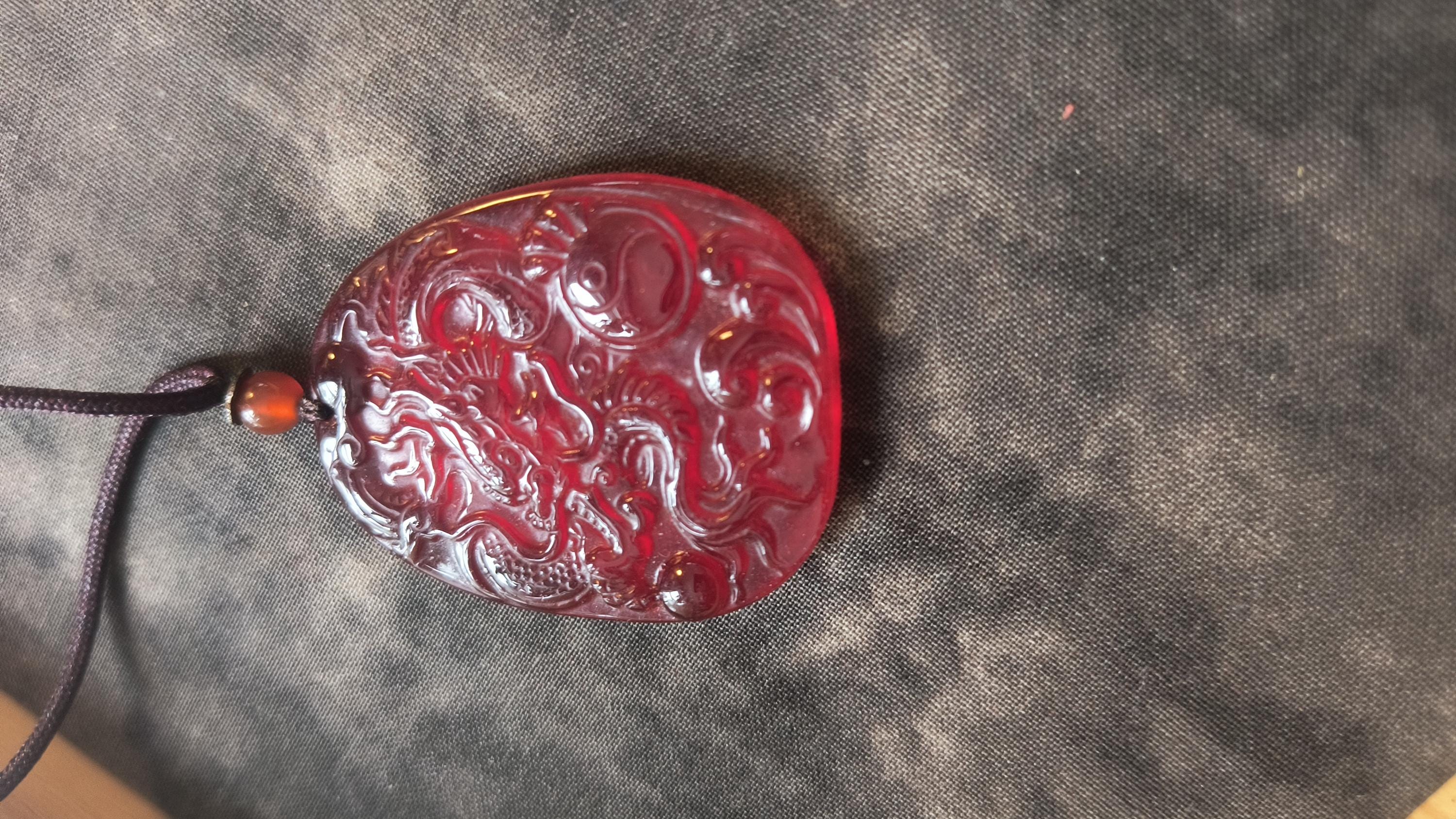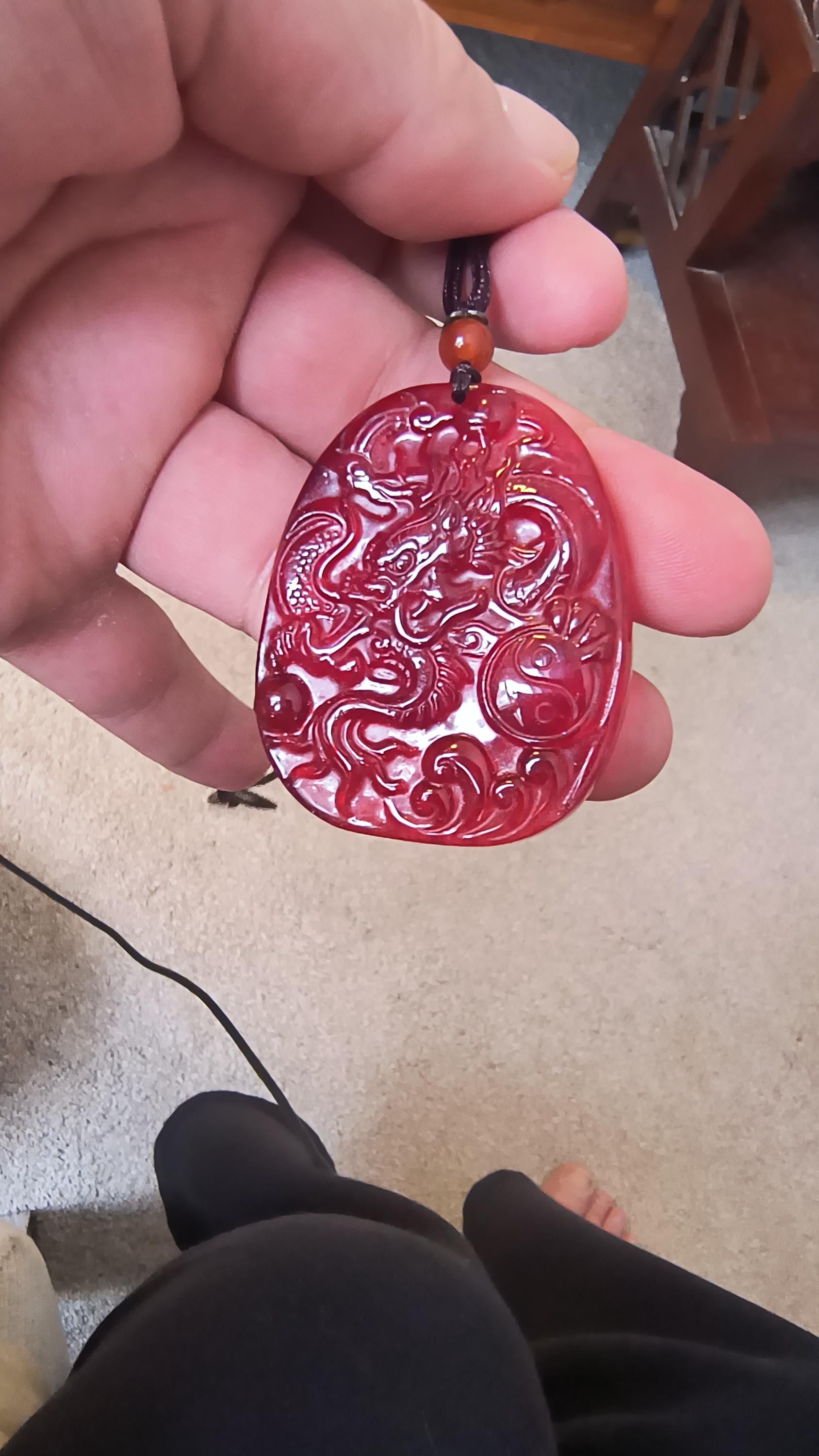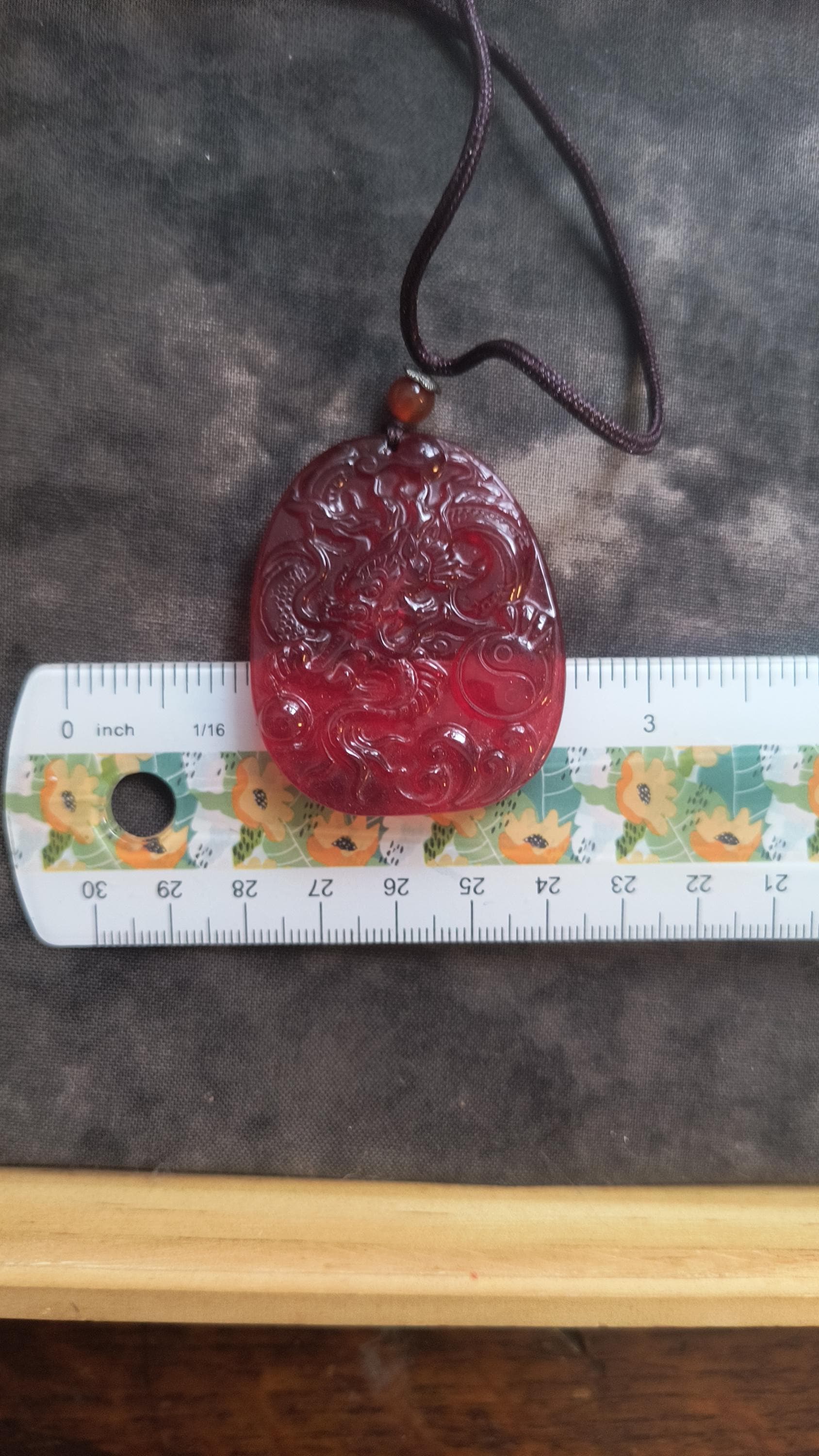 A dragon chasing a flaming Pearl across the sky is a symbol of good luck, prosperity and especially wisdom and spiritual energy. Here the scene is carved in red Jadeite, called "Ice Jade" for it's translucency and clarity.