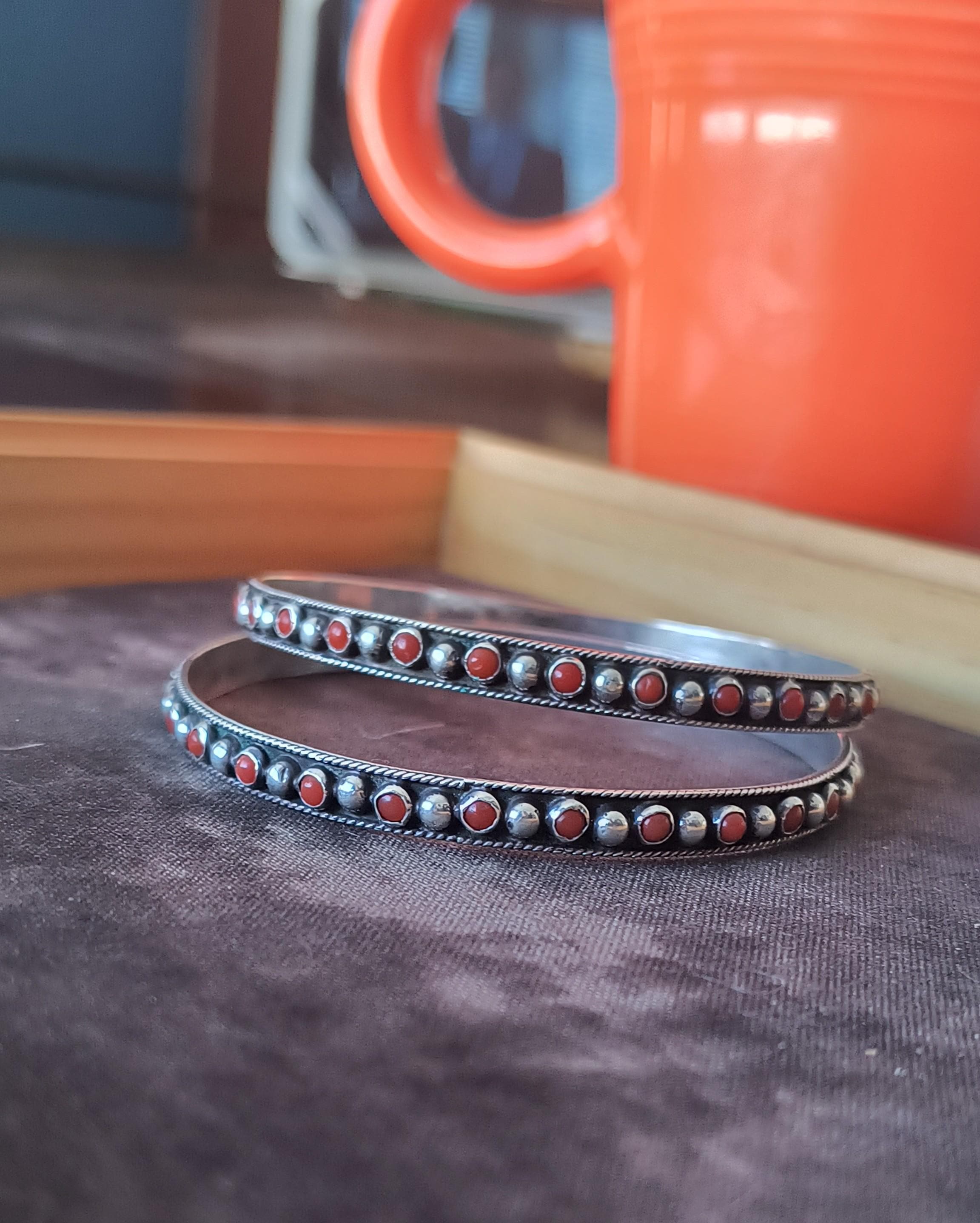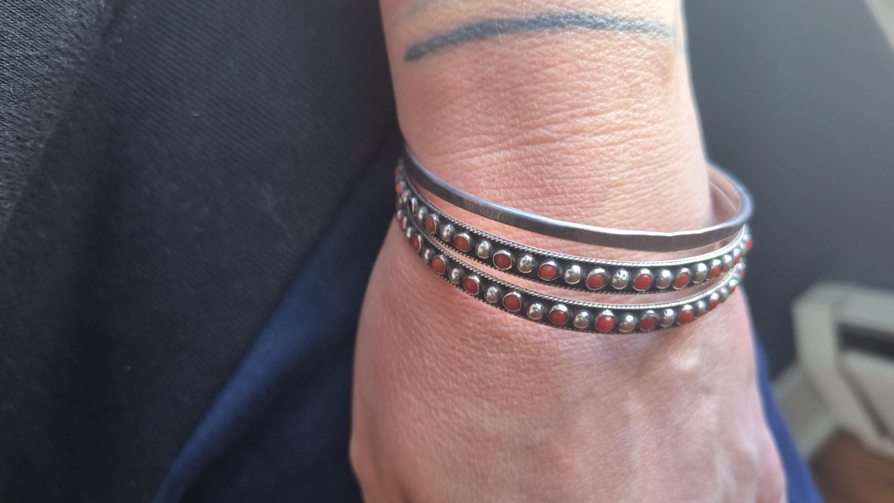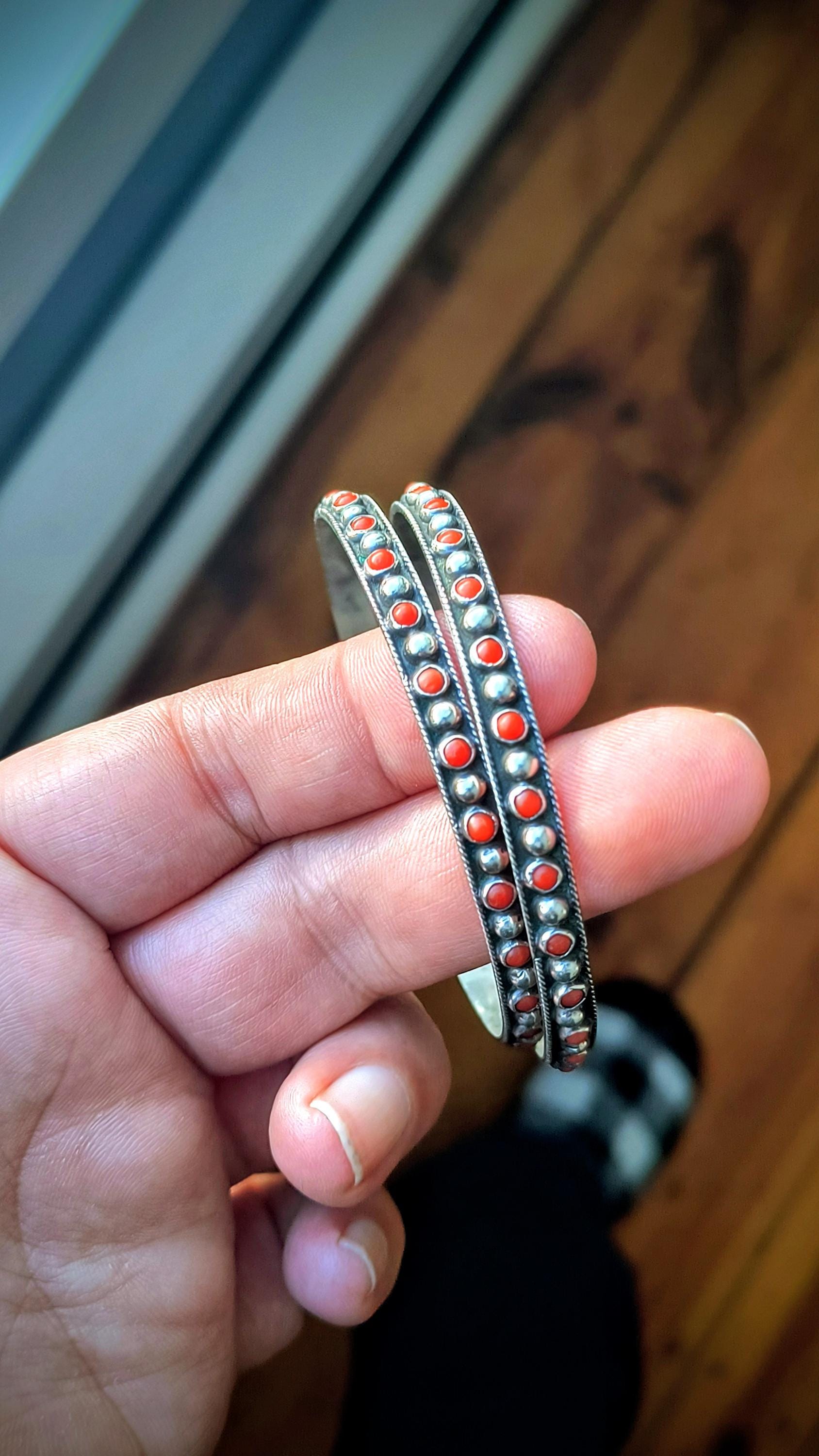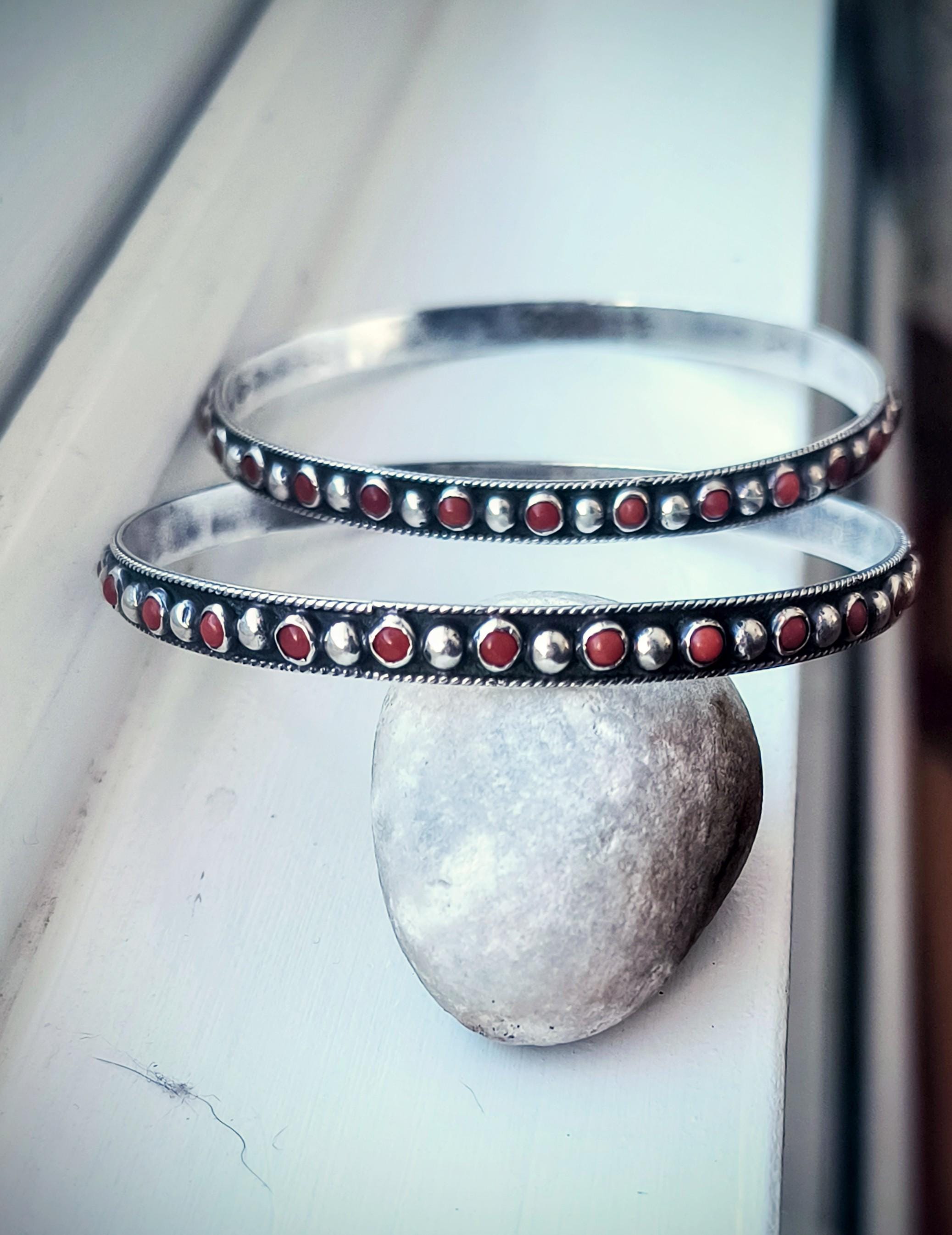GEM: Natural red coral cabochons - please note that one gem is missing in each bangle. Replacement gems may be available, please reach out for details.