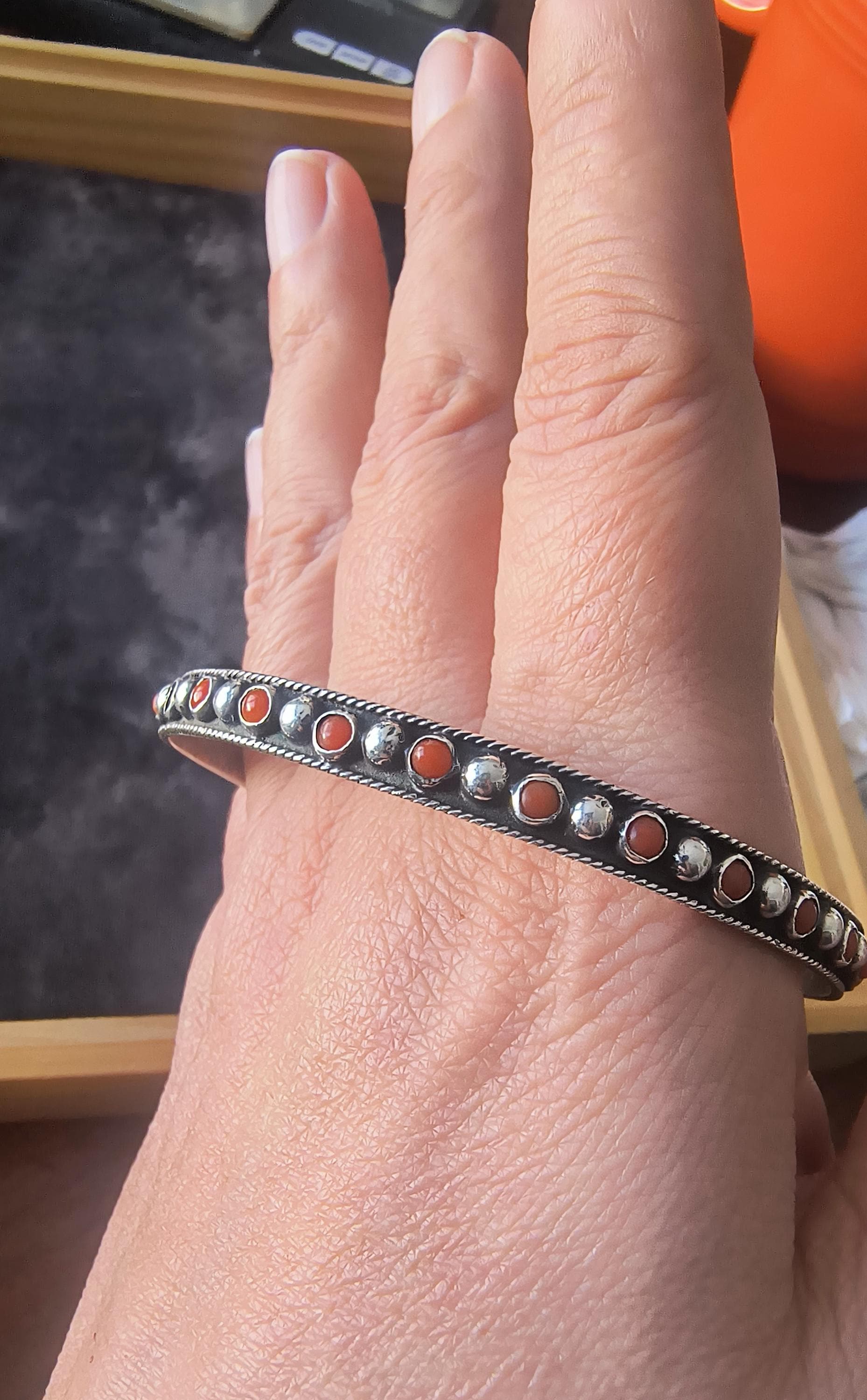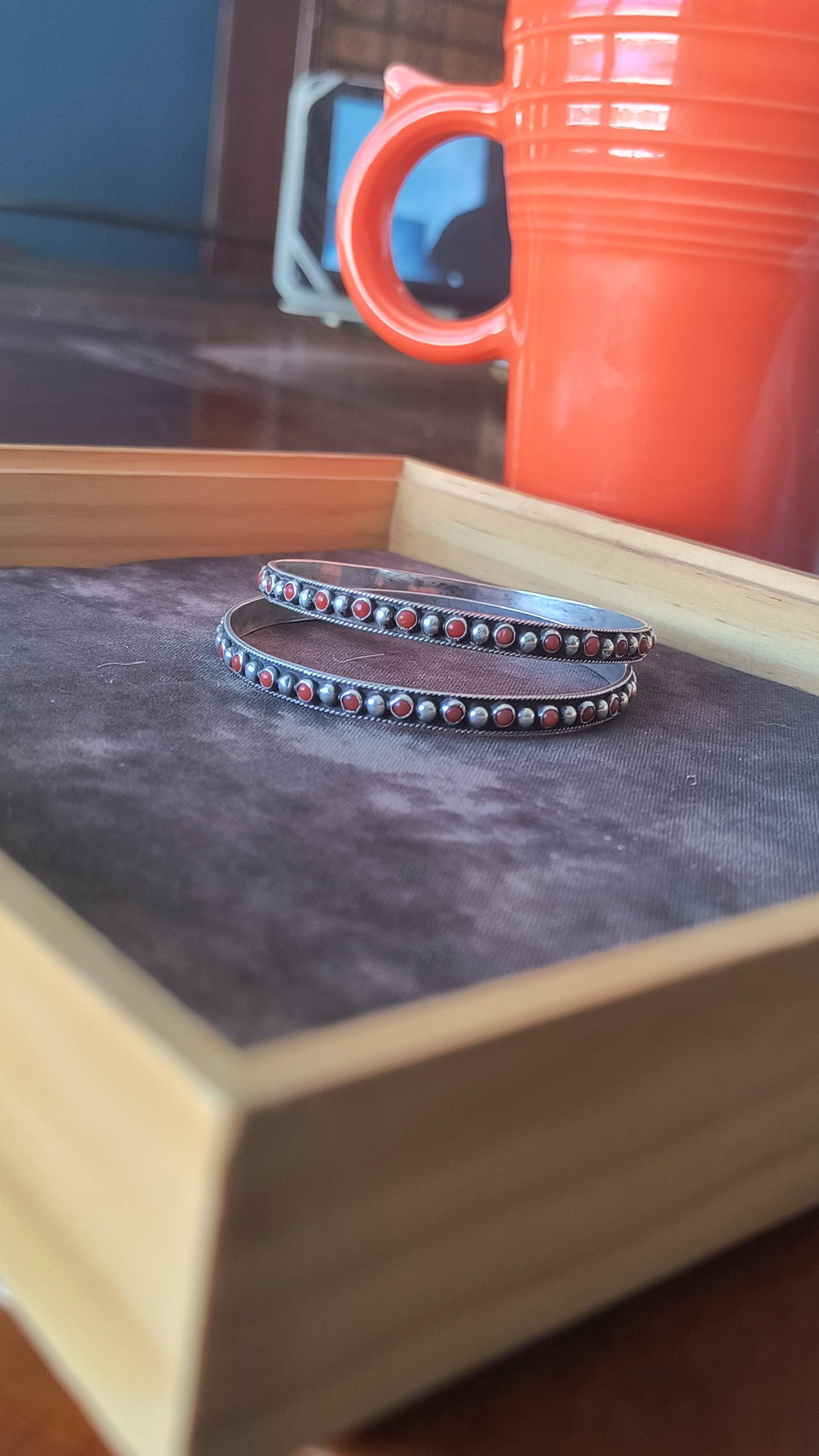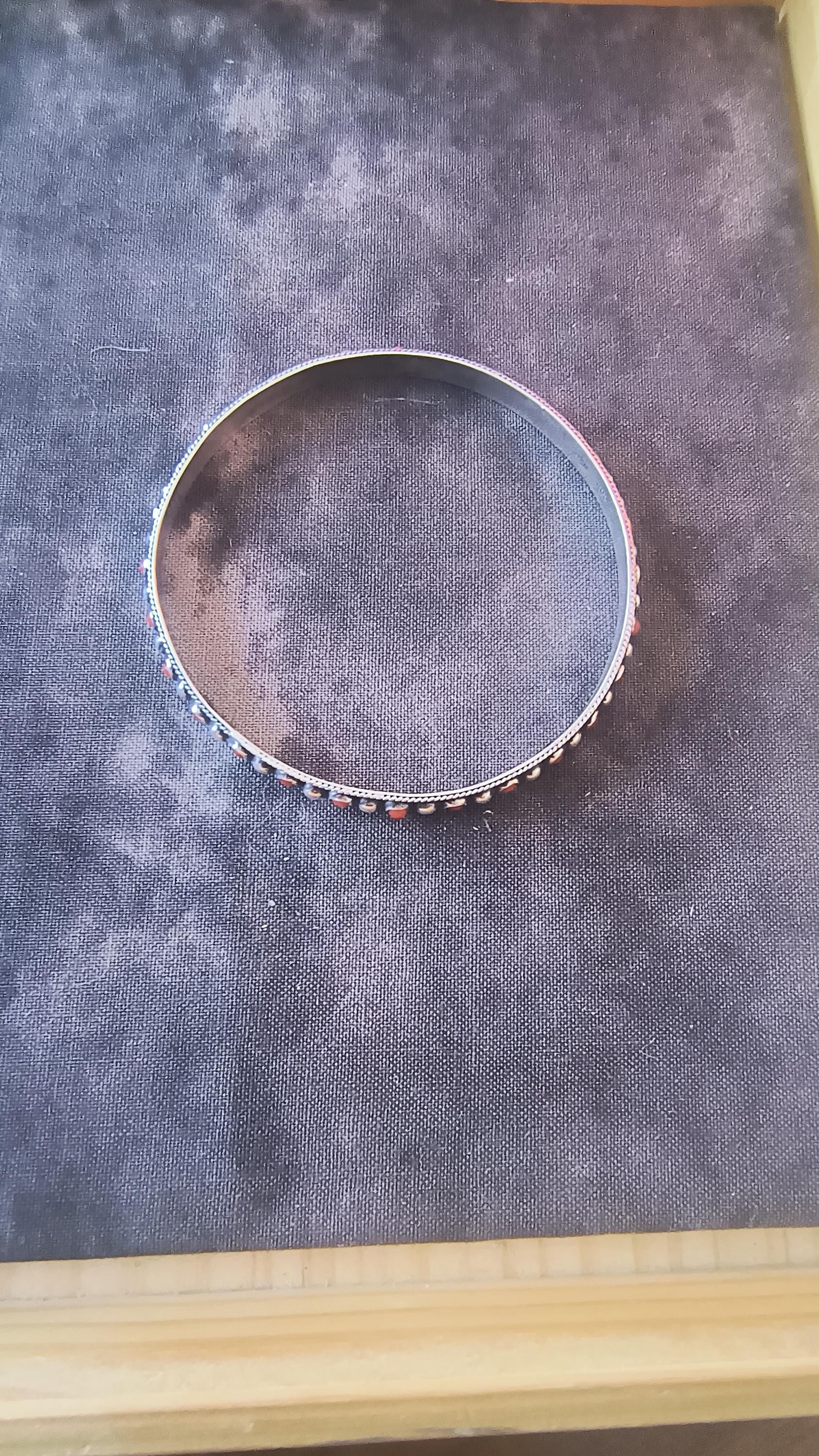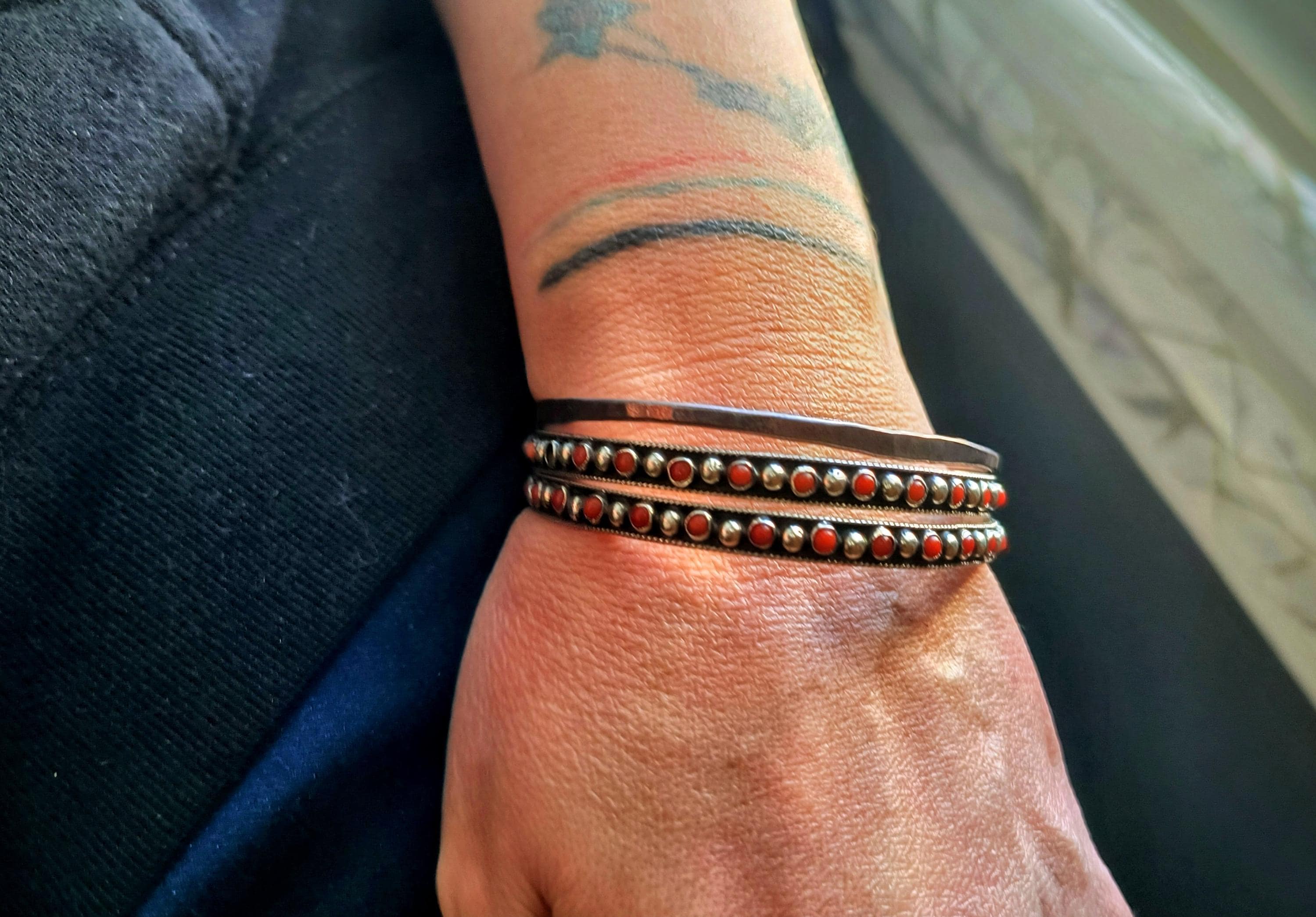 GEM: Natural red coral cabochons - please note that one gem is missing in each bangle. Replacement gems may be available, please reach out for details.
