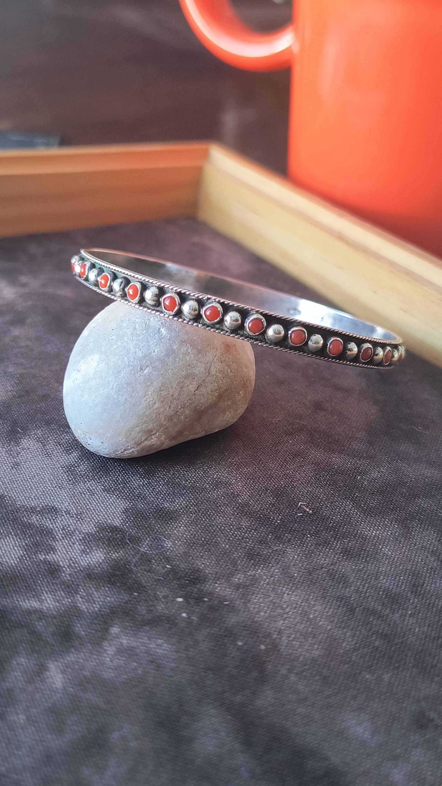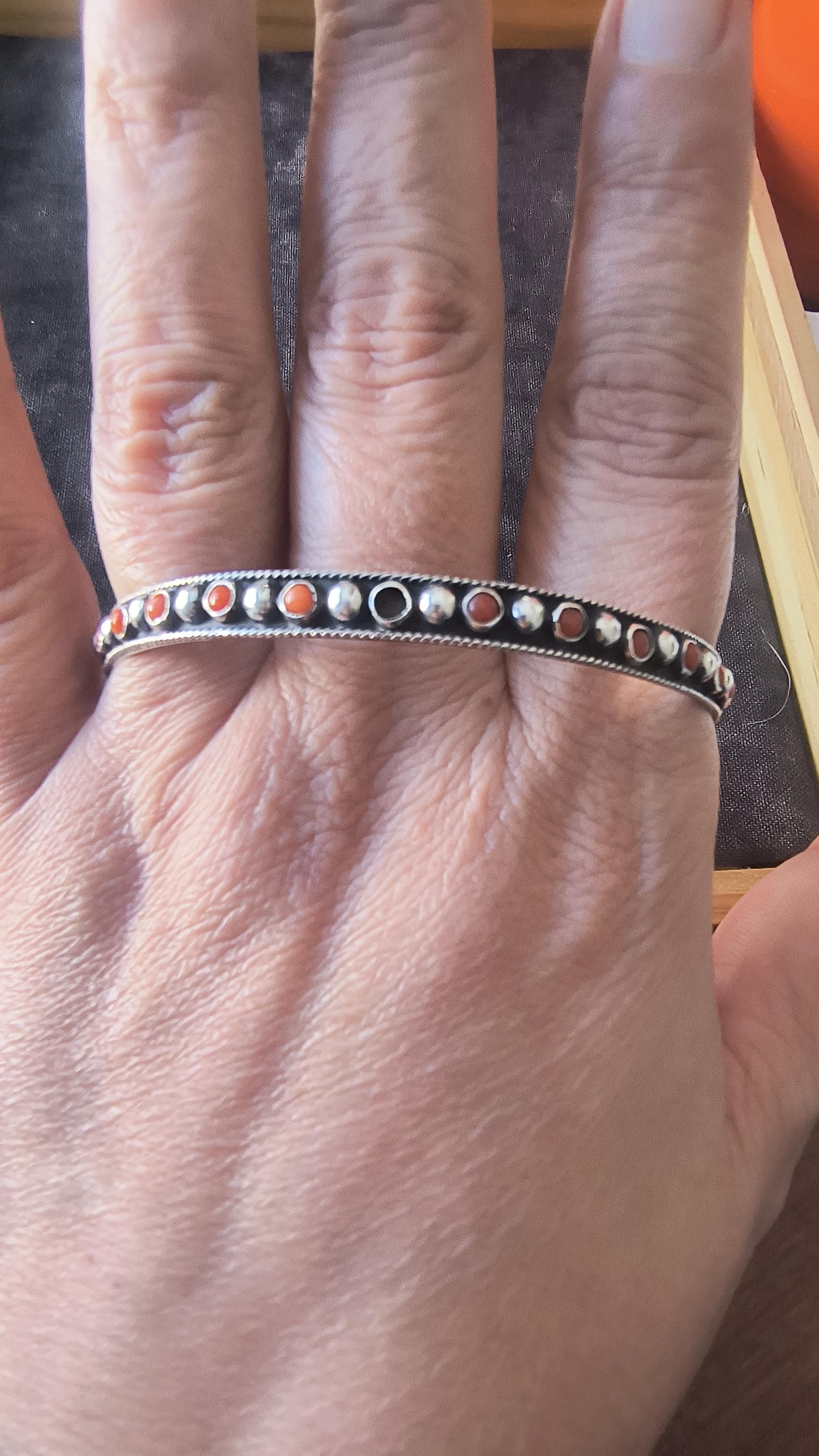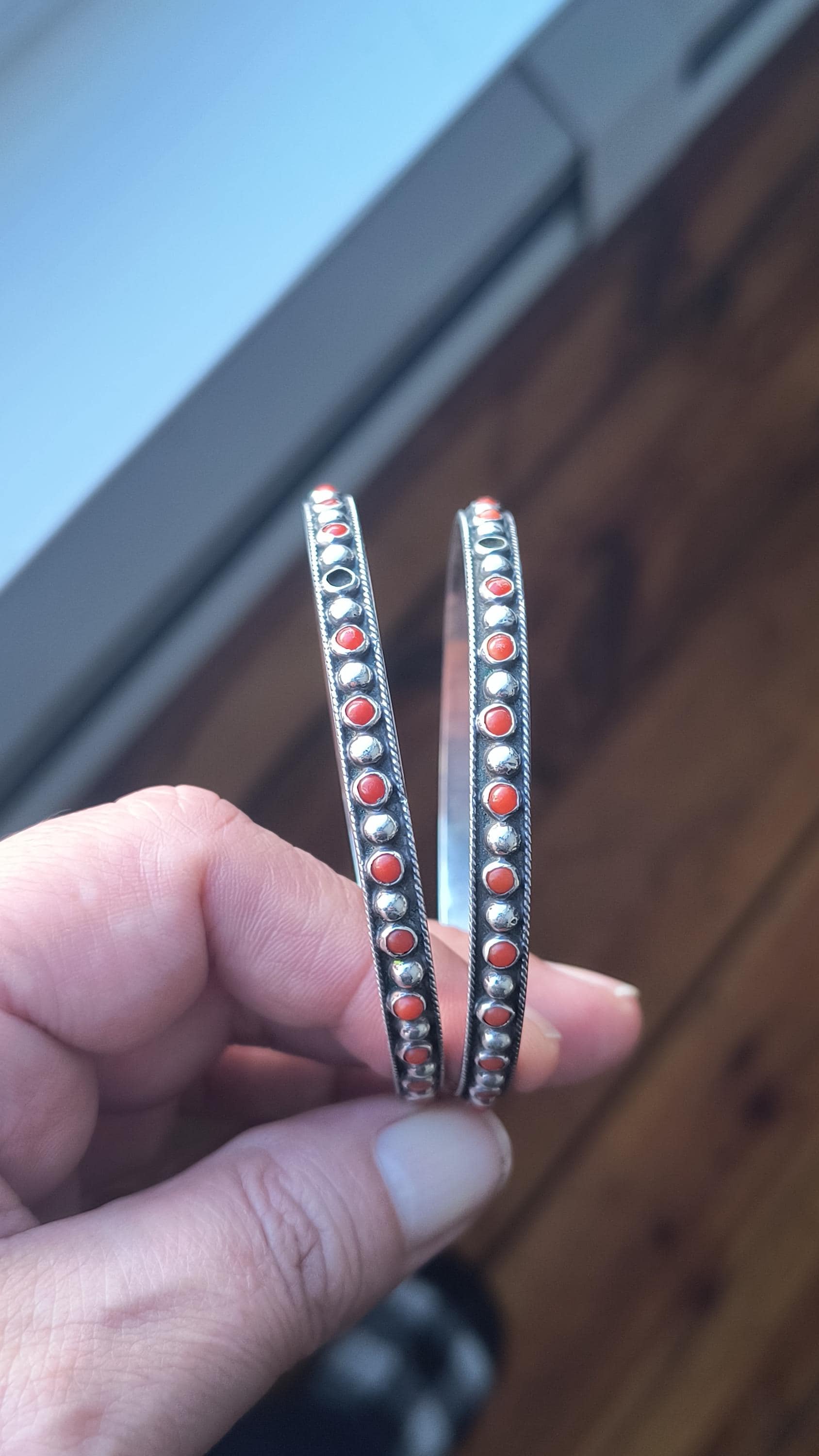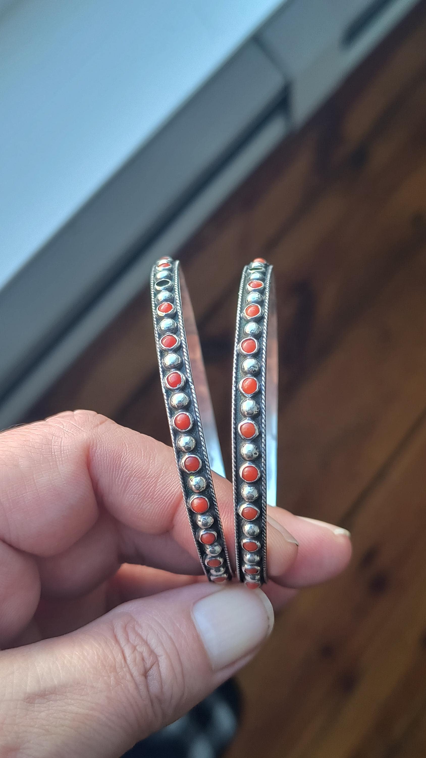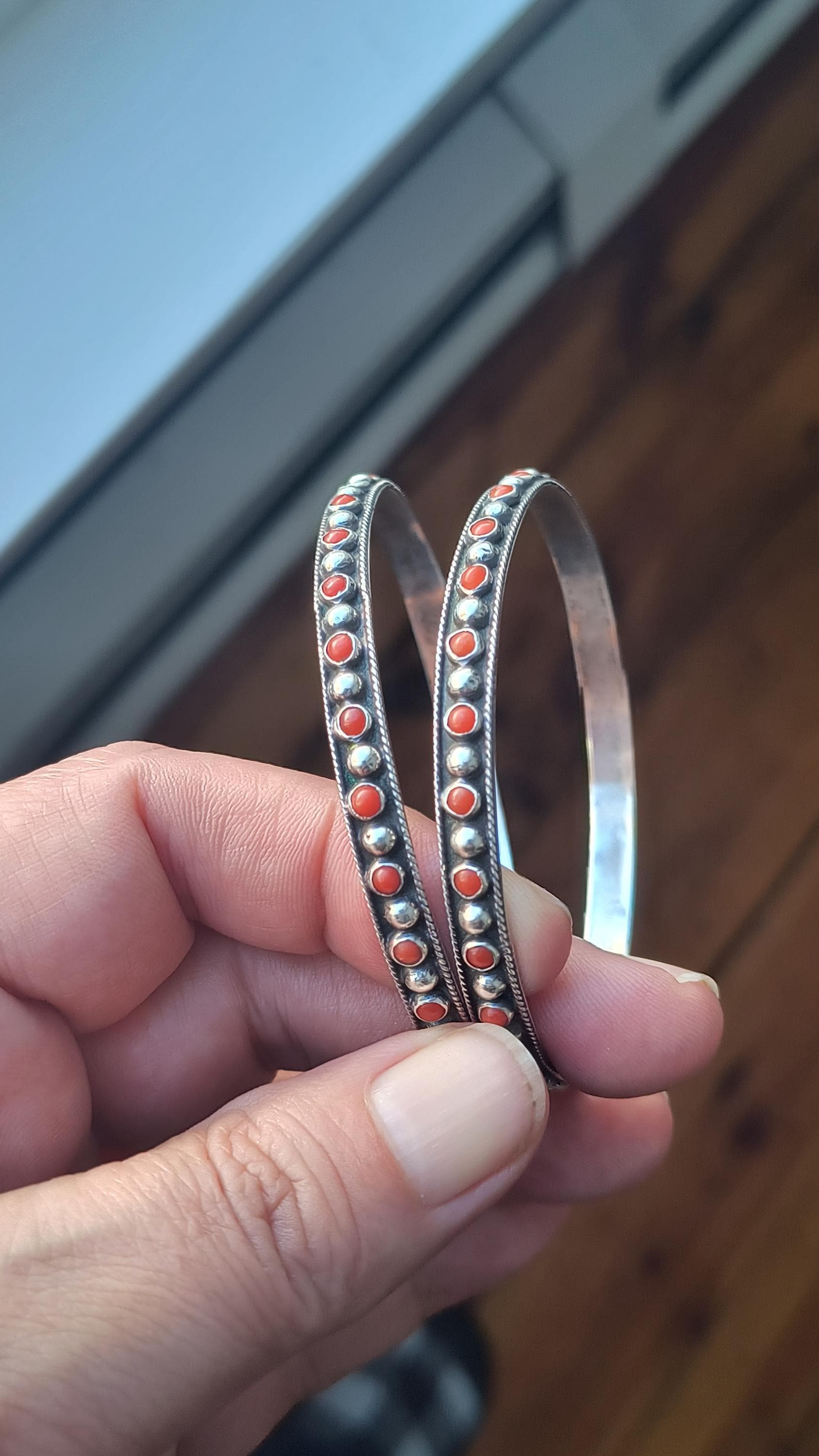 GEM: Natural red coral cabochons - please note that one gem is missing in each bangle. Replacement gems may be available, please reach out for details.
