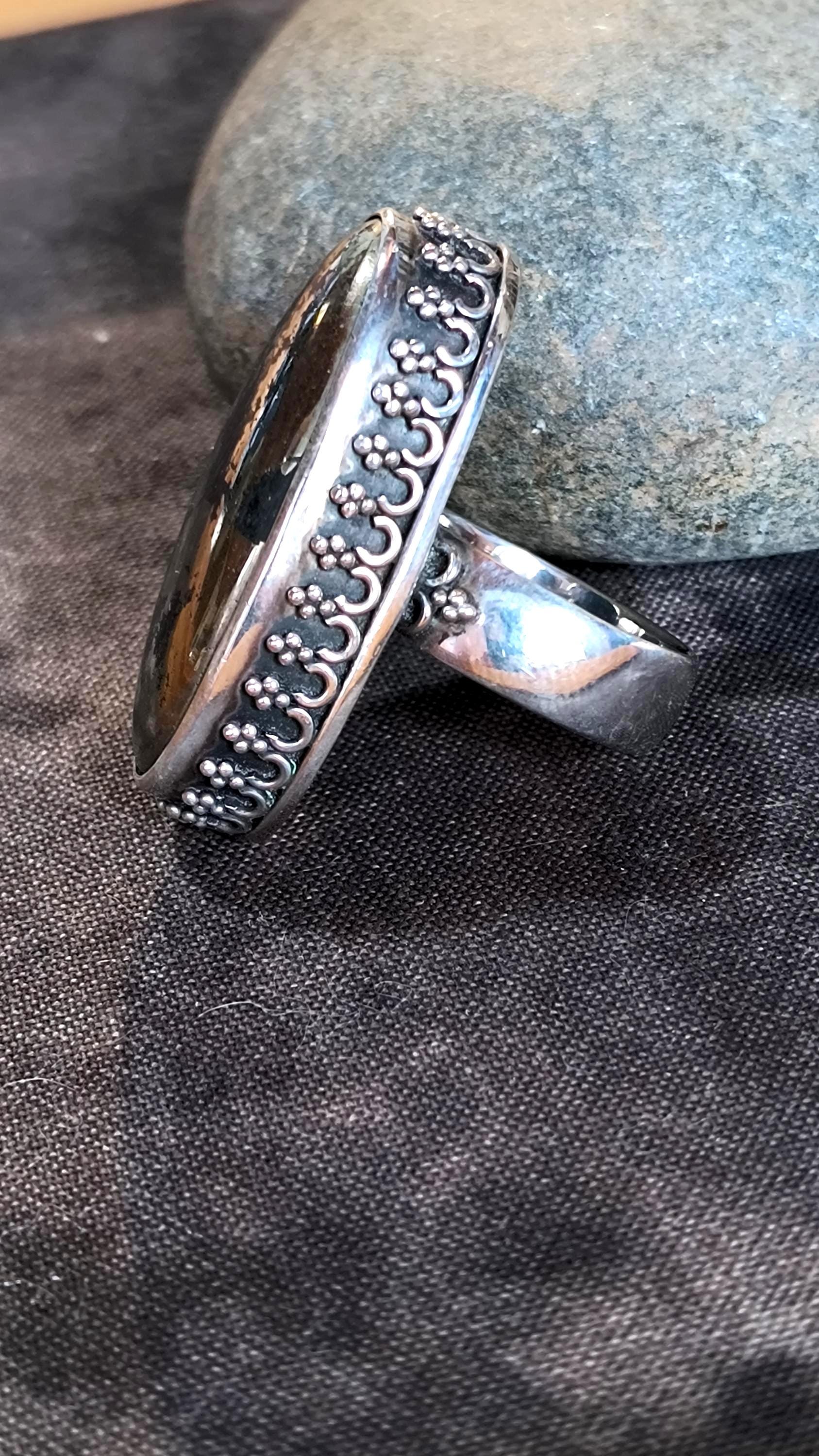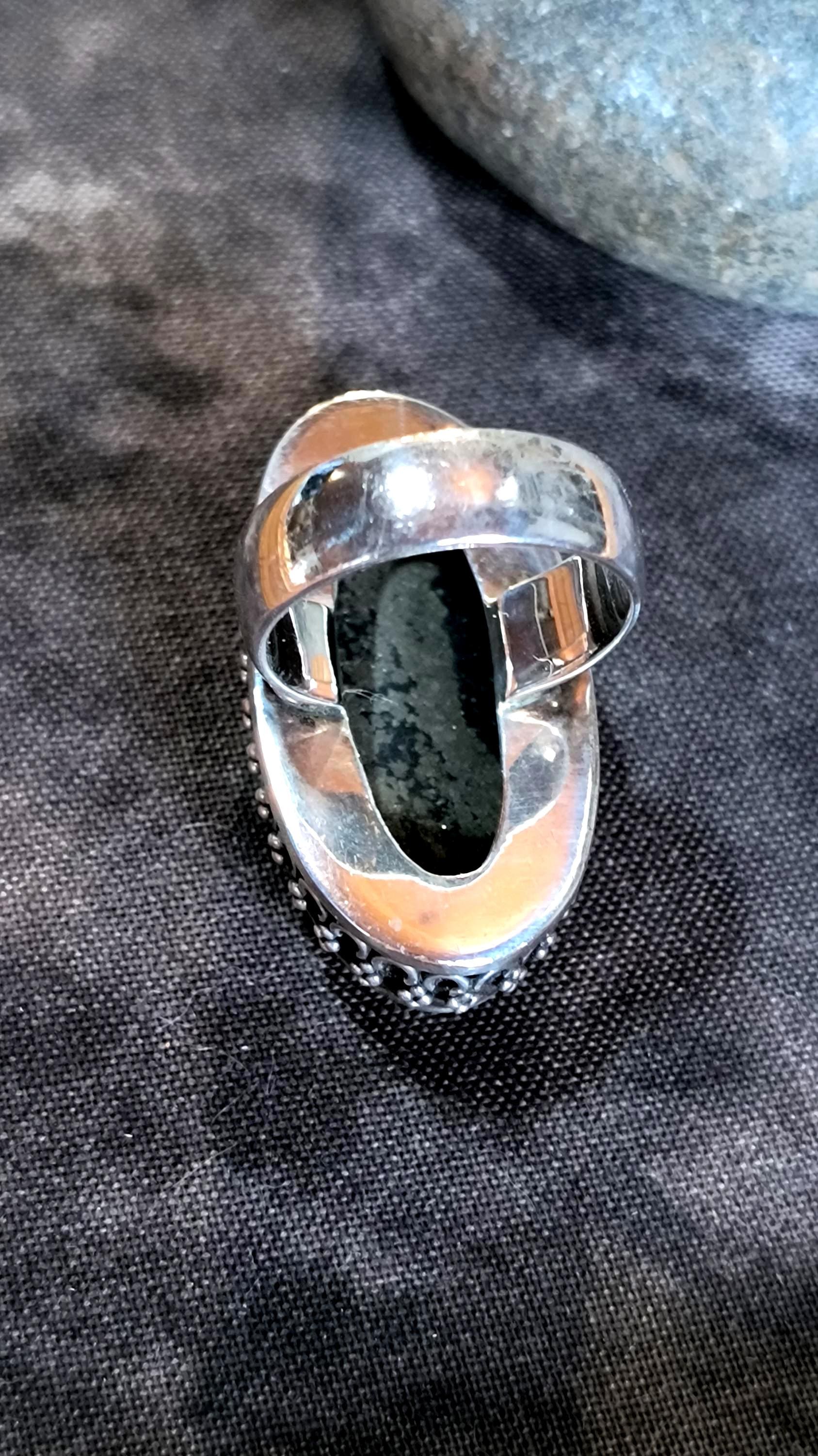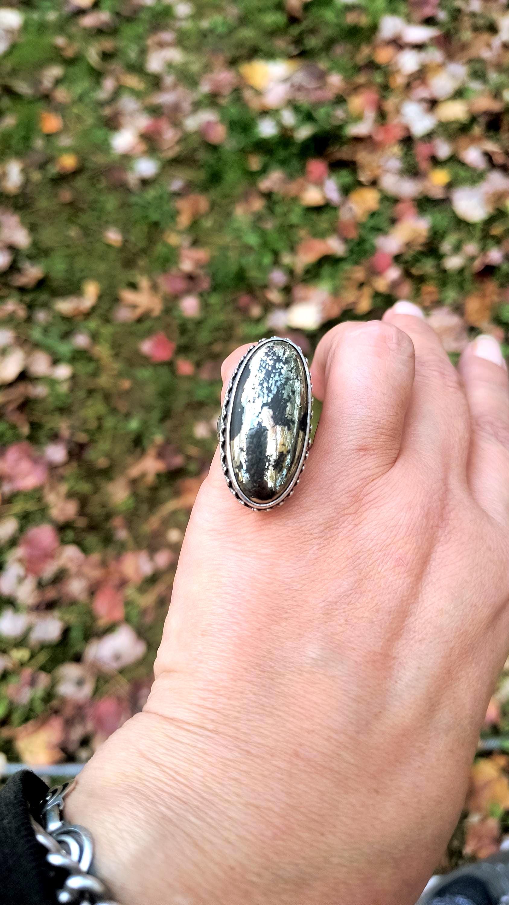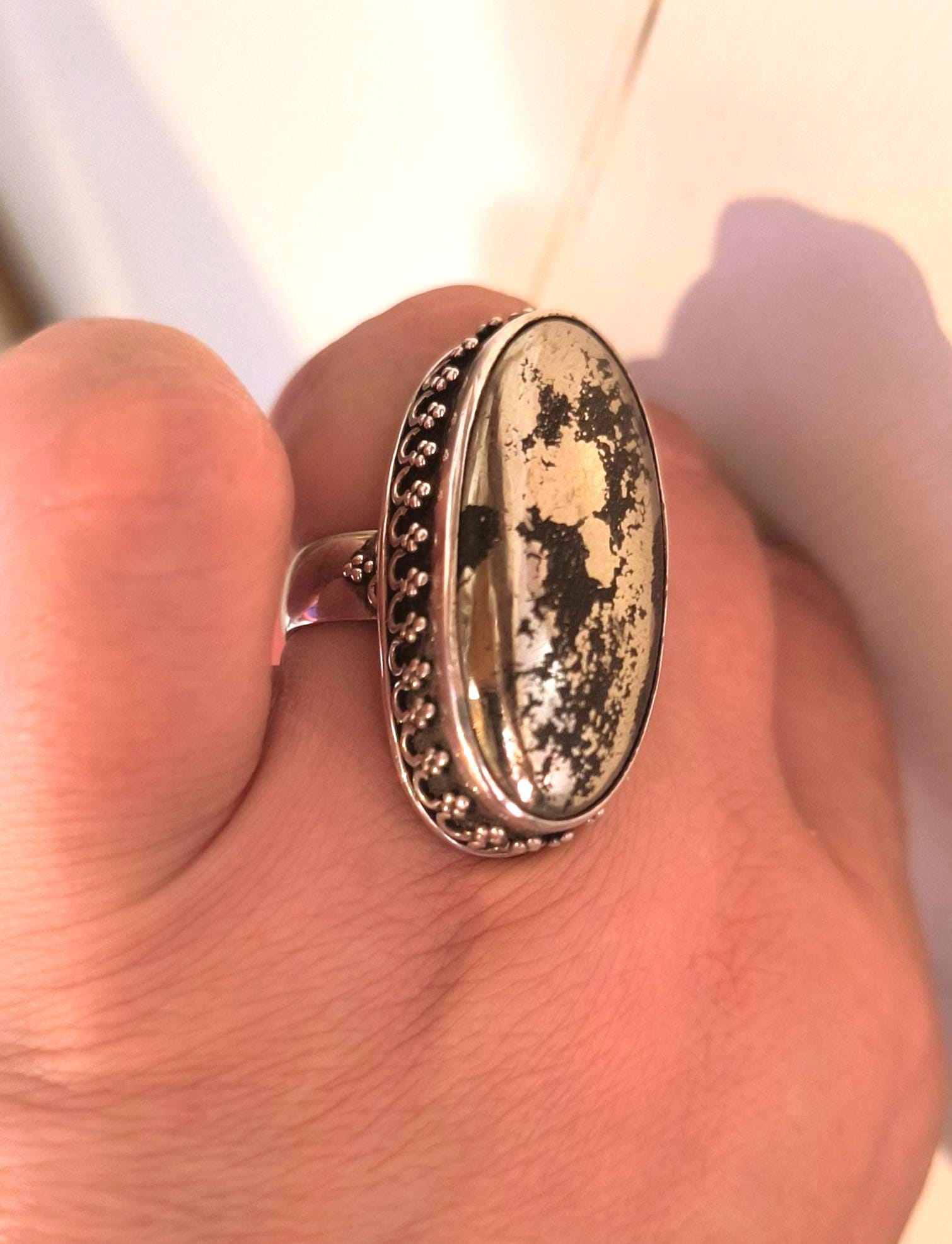 This type of gem, with pyrite flowing into a magnesite matrix, is common to Arizona and the ancestral lands of the Apache tribe - hence the trade name, 'Apache Gold'. Pyrite has long been considered a stone of protection, and particularly of wealth, abundance and financial gain! This particular piece is long and weighty, set in a perfectly balanced sterling silver bezel, and with a wide band that keeps it comfortable on the finger.